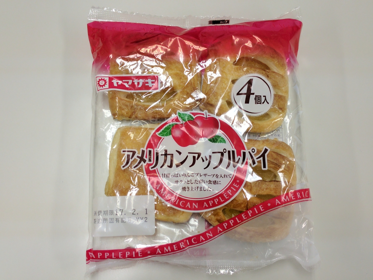 練習後の補食: ヤマザキ アメリカンアップルパイ (155kcal,たん白質2.7g,脂質6.9g,炭水化物20.4g *4)。