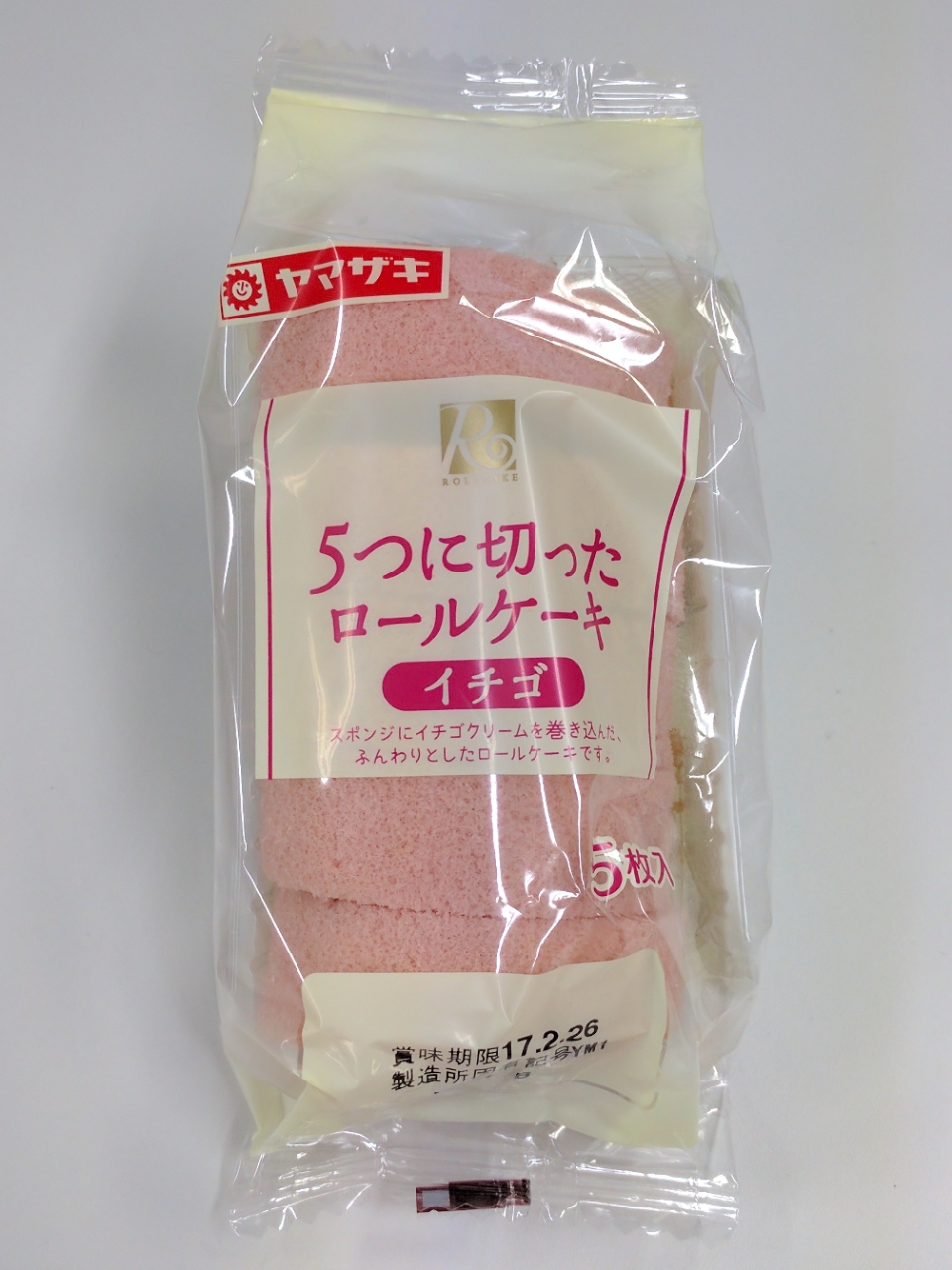 練習後の補食: ヤマザキ 5つに切ったロールケーキ いちご(502kcal,たん白質7.5g,脂質14.8g,炭水化物84.8g)。