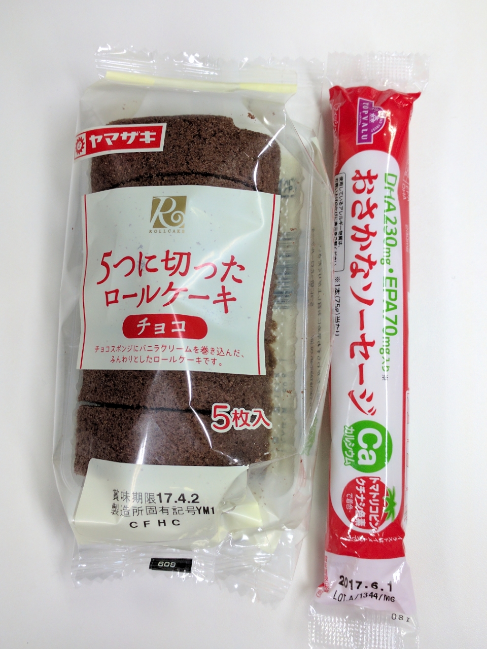 練習後の補食: TVおさかなソーセージ(115kcal,たん白質6.9g,脂質4.7g,炭水化物10.9g 、ヤマザキ 5つに切ったロールケーキ チョコ(487kcal,たん白質8.0g,脂質16.1g,炭水化物77.4g)。