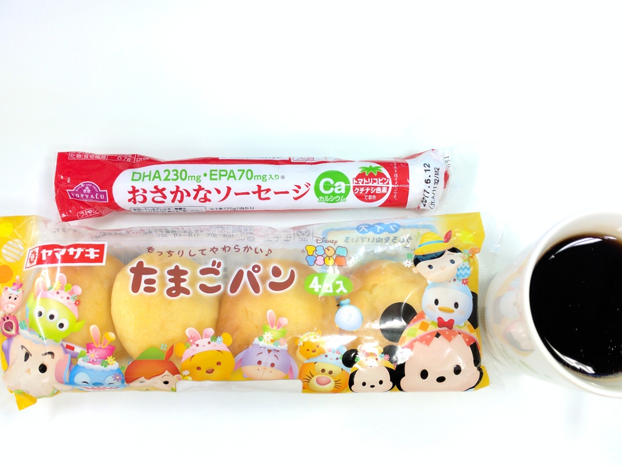 練習後の補食: ヤマザキ もっちりしてやわらかい♪たまごパン(103kcal,たん白質1.5g,脂質4.5g,炭水化物14.0g *4)、おさかなソーセージ。