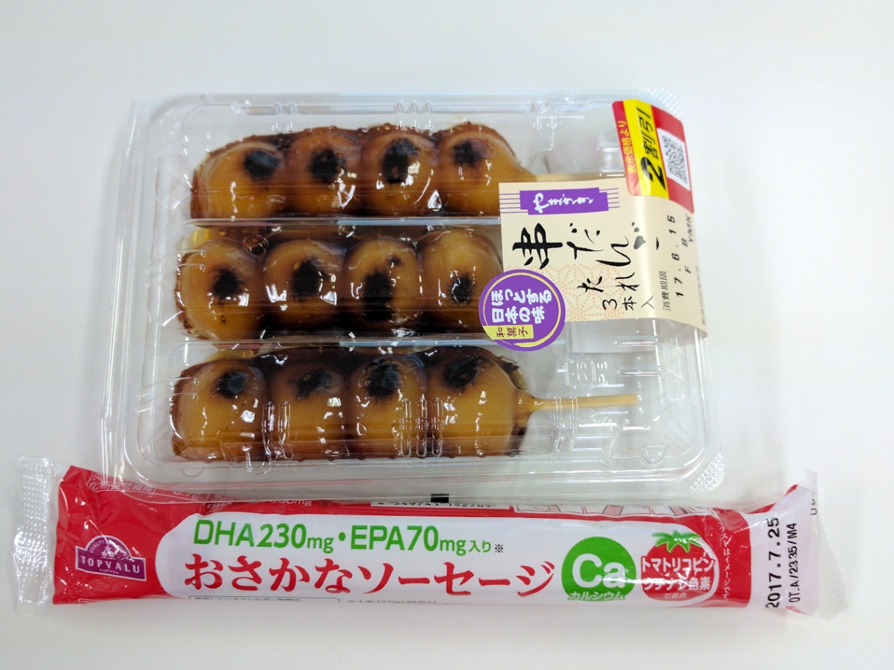 練習後の補食: おさかなソーセージ、だんご2本。