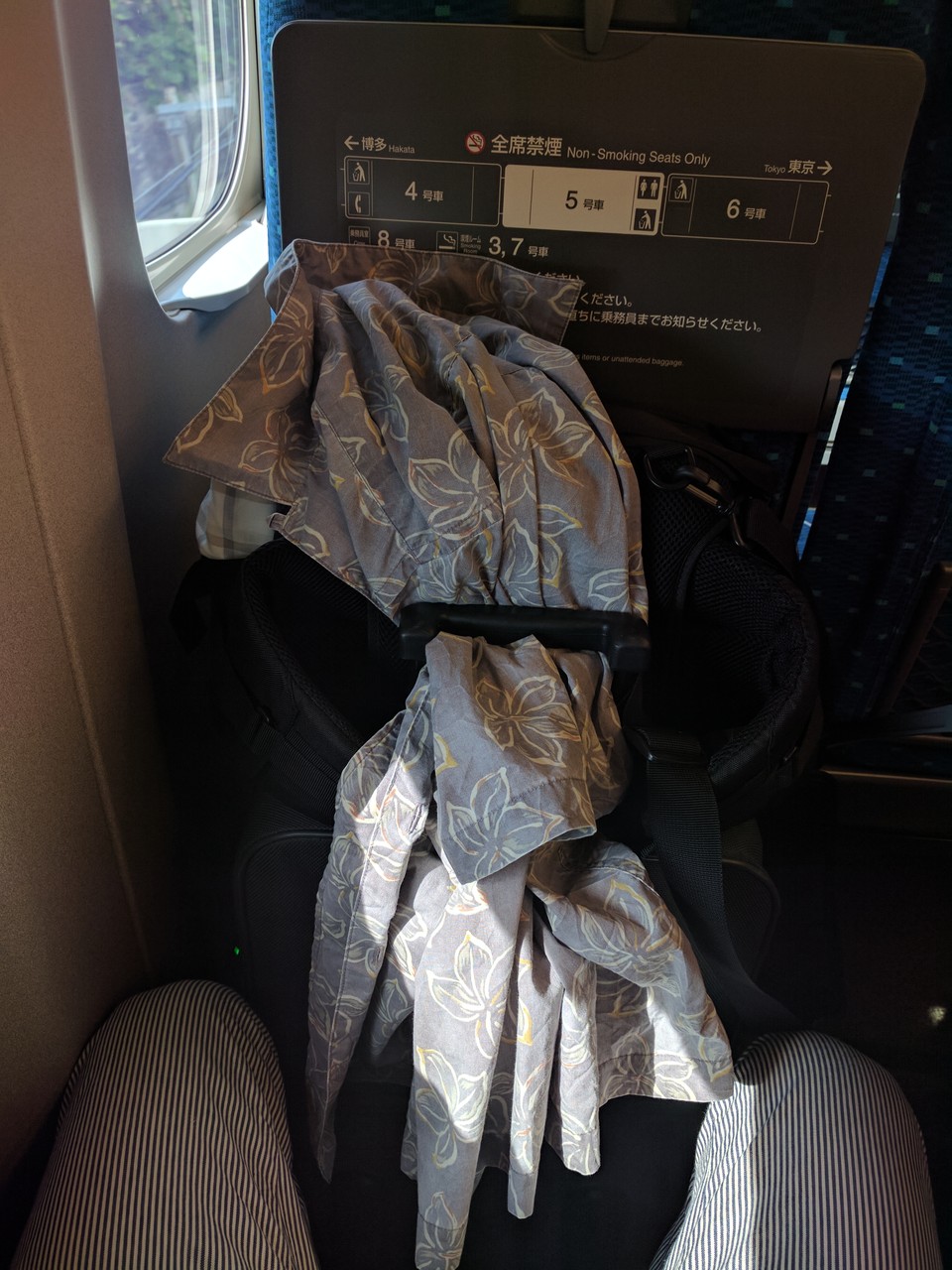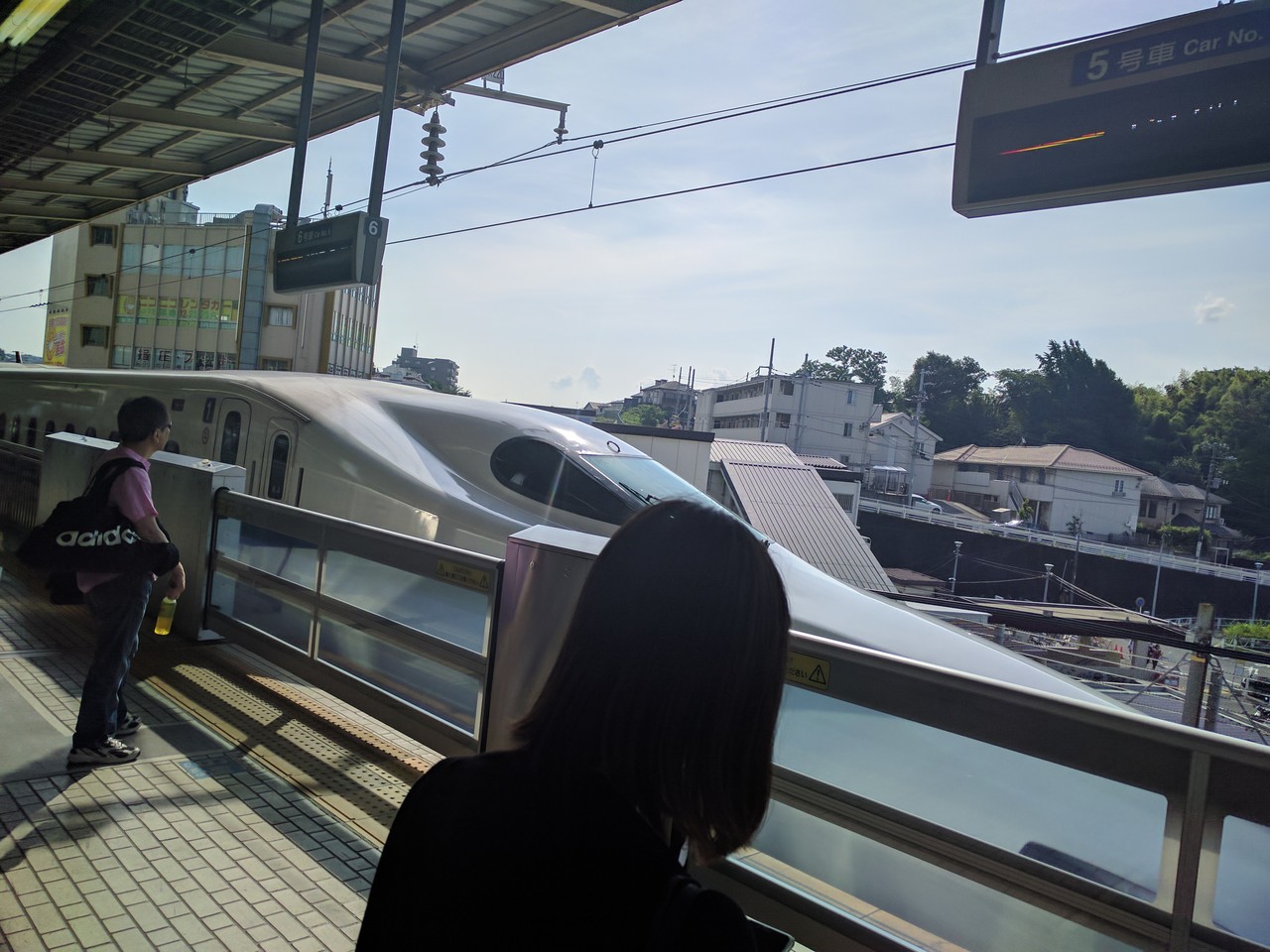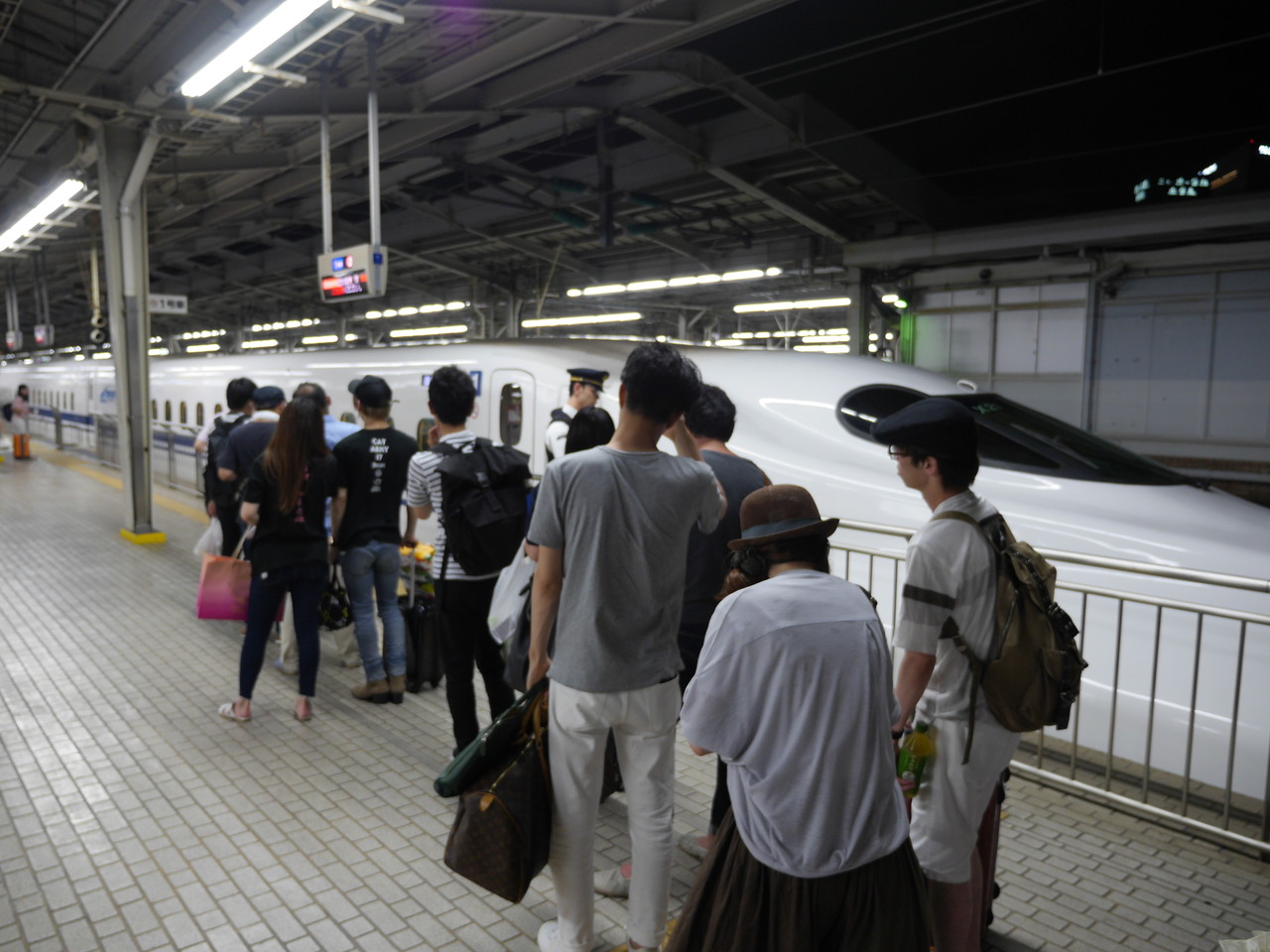 やっとのことで新大阪に着いて指定席をとろうとしてら取れず、のぞも自由席1号車をねらうと、あんがい入ってきた列車の座席は空いていて苦労なく座れた(といってもほぼ満席状態)。