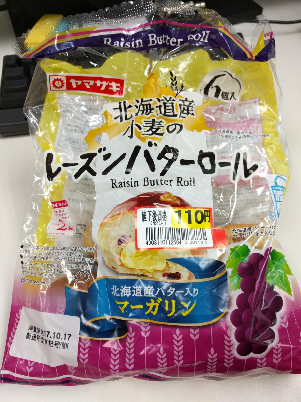 練習後の補食: ヤマザキ 北海道産小麦のレーズンバターロール (166kcal,たん白質2.6g,脂質9.5g,炭水化物17.6g) *4。