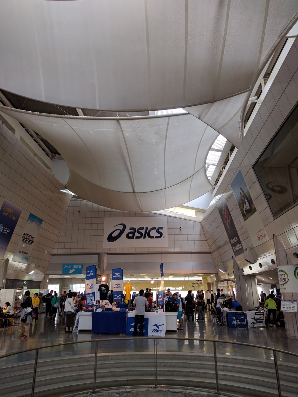さっそくメインプールへアップへ。水がつめたい。水温27.3℃とマジ大会仕様だった。5分くらい泳いでたら馴れたけど。あと水深が深い。調べたら2.0mのようだ。いつも泳いでいるプールより深いと速度感覚がくるうので困るなぁ。あとスタートで潜りすぎてしまうのと。公式スタートは行列に並ぶ時間がもったいなかったのでナシで。アップのレーン割りはゆっくり・女子専用・はやいと分けられているのはよかった。30分くらいメインプールで泳いでからダイビングプールで5分くらいゆったり泳いでアップ終了。ダイビングプールも27.4℃と低くで、体冷えるからやめてほしい。。