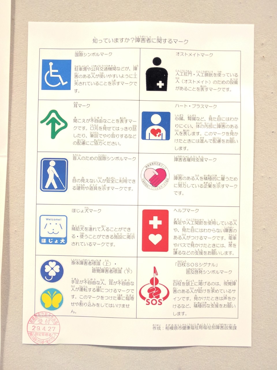 いろいろマークがあるけど、左上の車いすのピクトグラムくらいしかわからん。