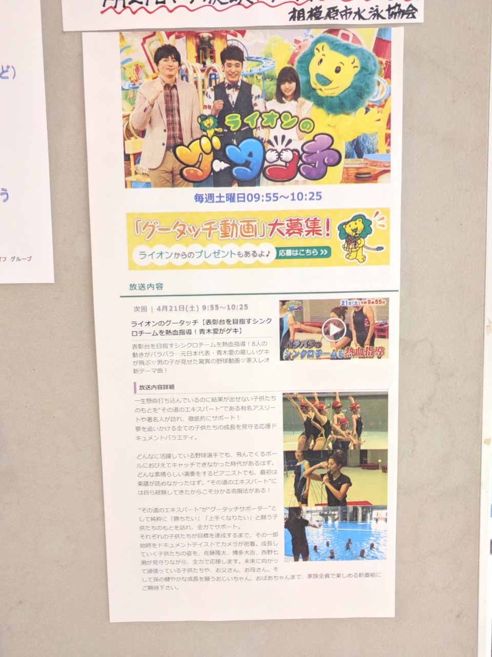 そういえば、夜の短水路プールでちびっこのシンクロの練習をよく見かけたが、グータッチって番組の練習だったのかな。