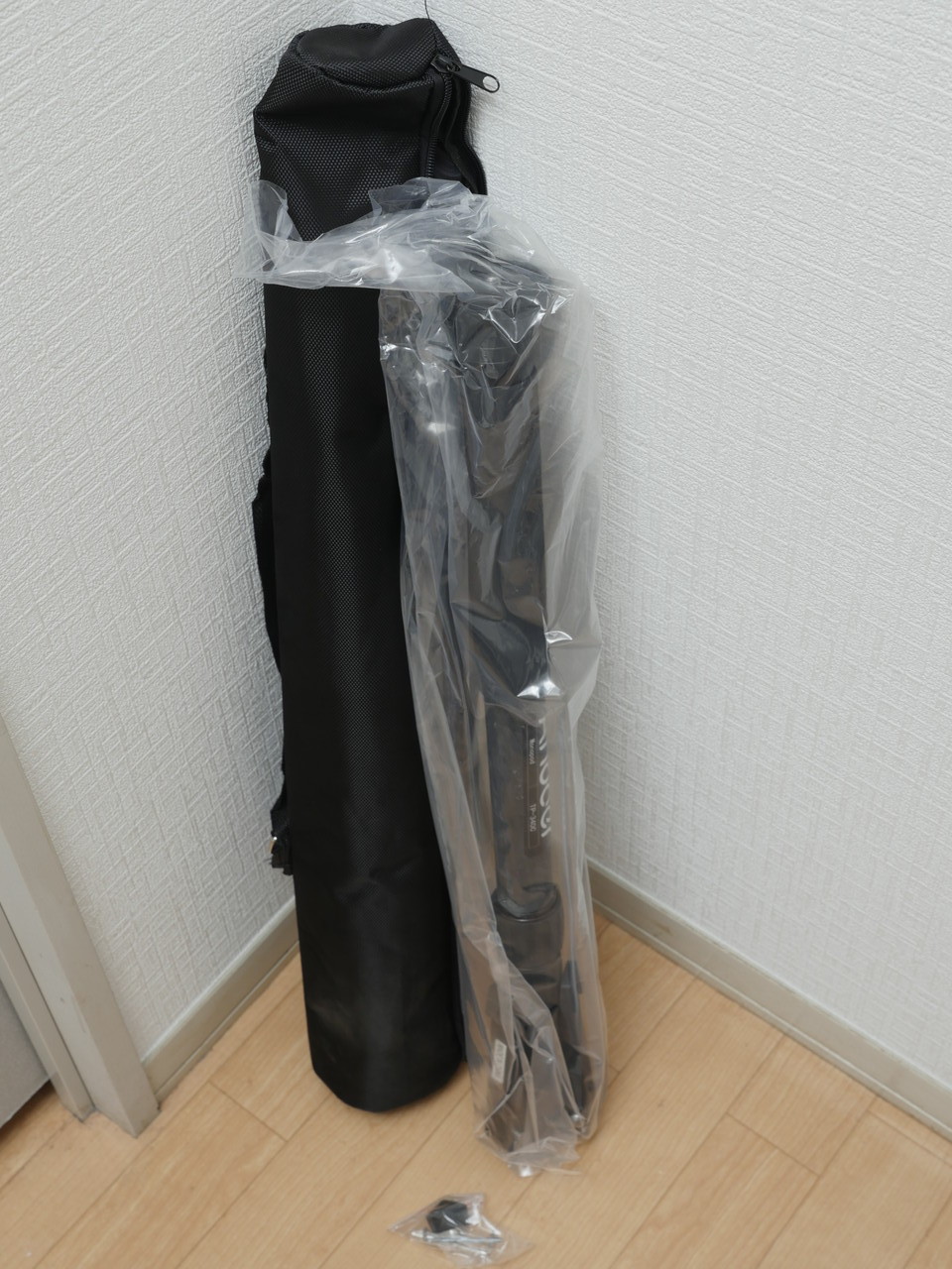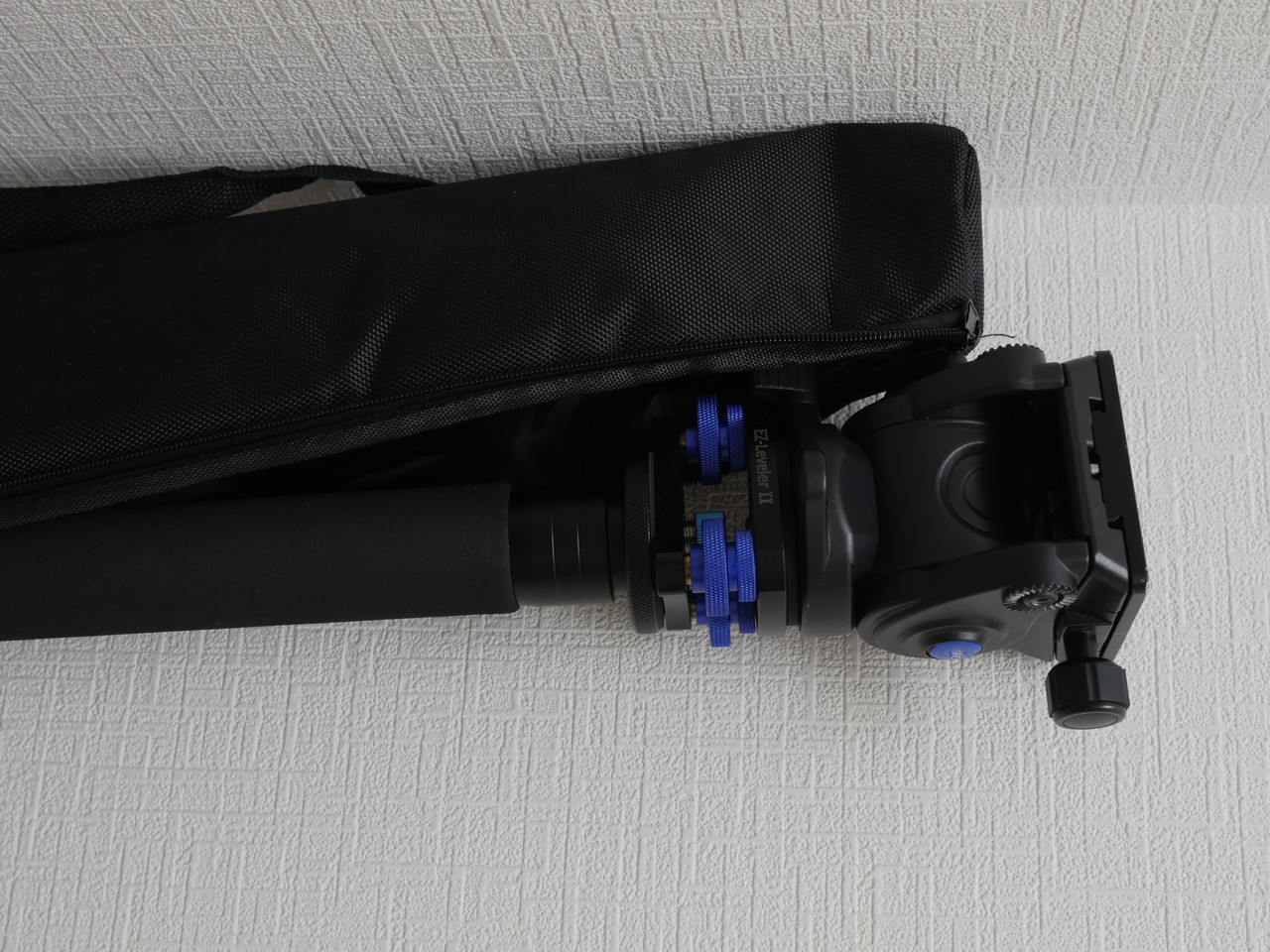 ケースが付属する。クッションは入っているが薄い。長さはちょっとだけ余裕があるが、中型雲台だと着けたままでは収納できず。ポケットがついてないので付属の石突きとか六角レンチを入れておく場所はない。