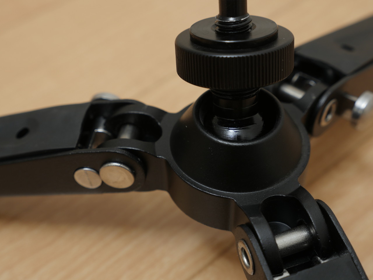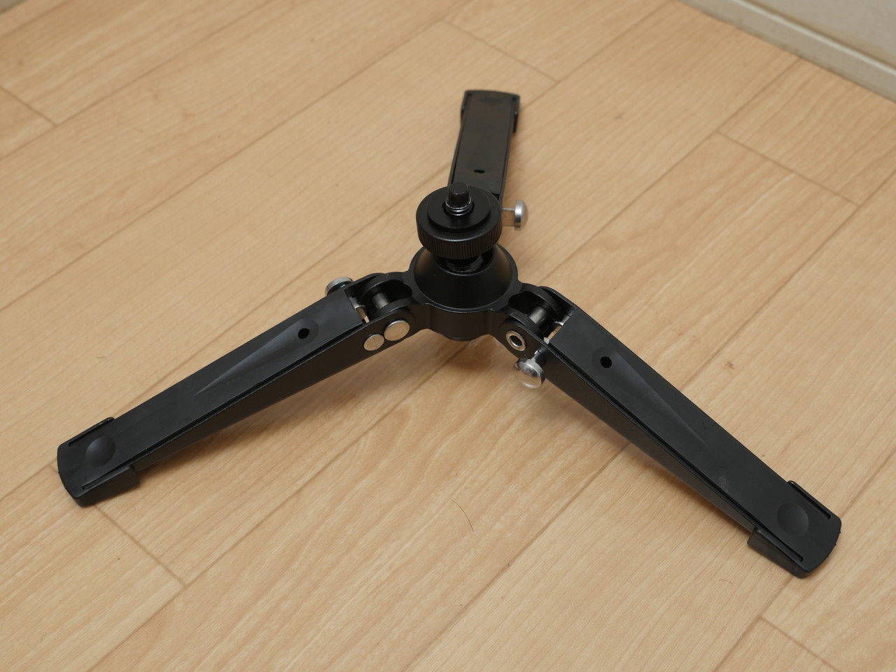 ミニ三脚部分はSIRUIのものと比べると小さめで一辺が15cmくらい。三脚と一脚の間の自由雲台はネジを締めると直立した状態で固定できて、水平なところなら載せても自立できる。安心感ゼロだけど。ミニ三脚は一脚からネジ(太ネジ)で分離できるようになっているのでテーブル三脚としても使えないこともない。角度調整できるように自由雲台の構造になっているが摩擦力が調整できないため一脚といっしょにつかったときにちょうどよい堅さになっているので単体で使うとテコの原理が効かないため堅すぎて角度調整に力がいる。