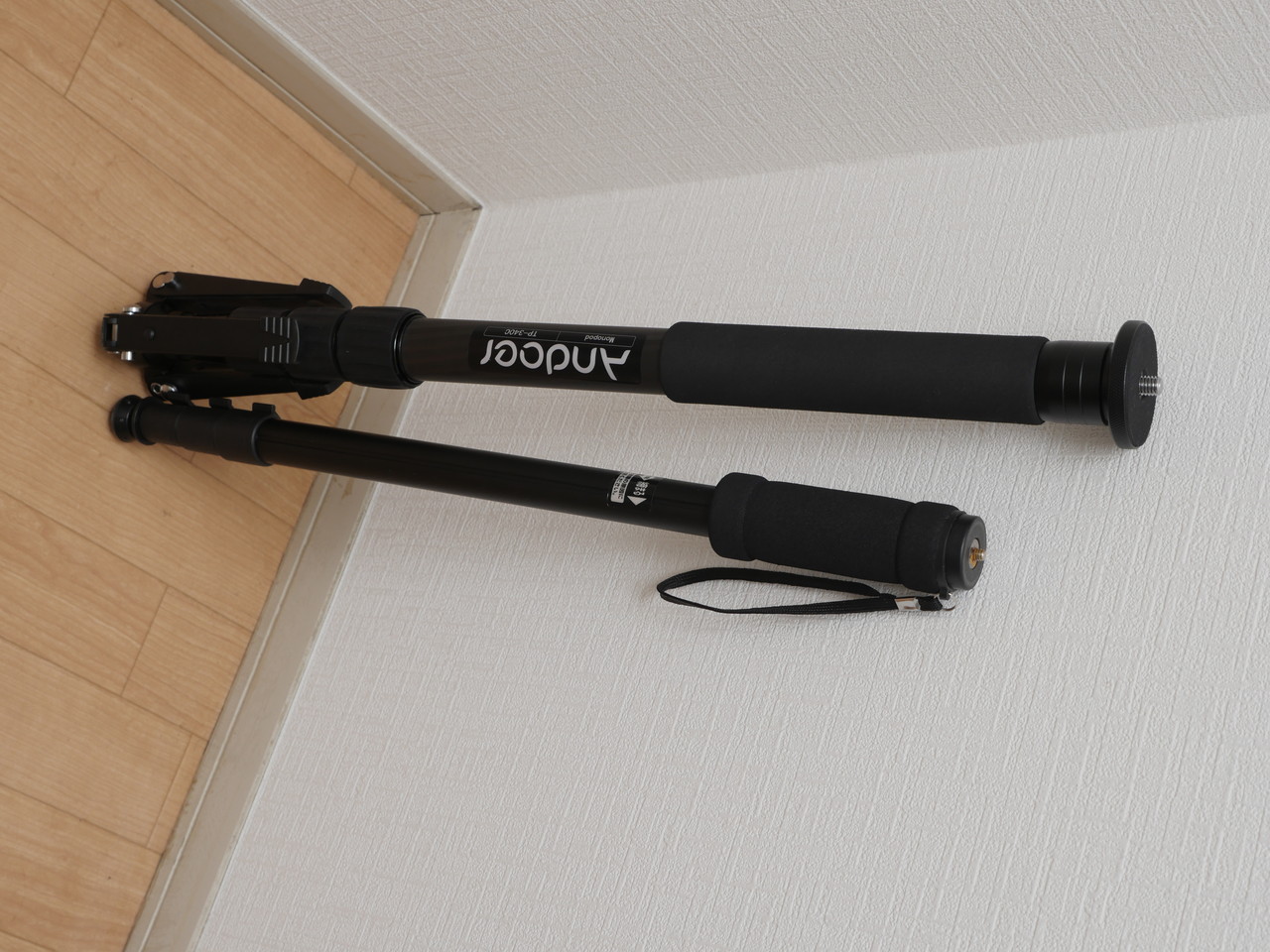 一脚部分は剛性は十分。伸縮はちょっとひっかかりがあり動きがスムーズではないが、使い込んでいくうちにアタリがとれて良くなるかもしれない。伸縮はボールナットタイプだがネジ部分にグリスが塗ってないのでザラついた感触。ネジを回す向きが常識とちがって上から見て右に回すと緩むのでこれだけはなんとかしてほしいところ(他の一脚でもそうなのかは知らん)。"Andoer"のシールが貼られているがちょっと傾いている。このへんが品質を物語っている可能性あり。取り外し可能なストラップがついているが、かんたんにスッポ抜けるので用を成さない。簡単に取り外せるようになっているので外してしまった。