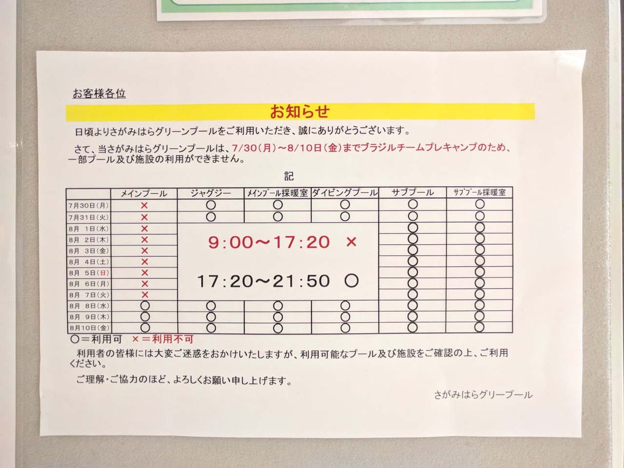 • ジャグジー・採暖室・ダイビング 8/1〜8/7 9:00〜17:20 使用不可