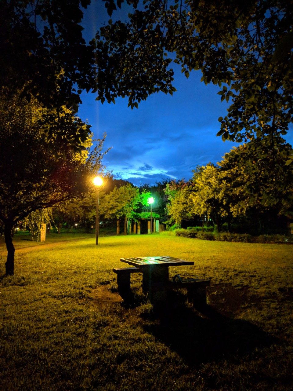 午後はかなり荒れて雨・風が強かったが夕方にはおちついた。夜のグリーンプールへ。