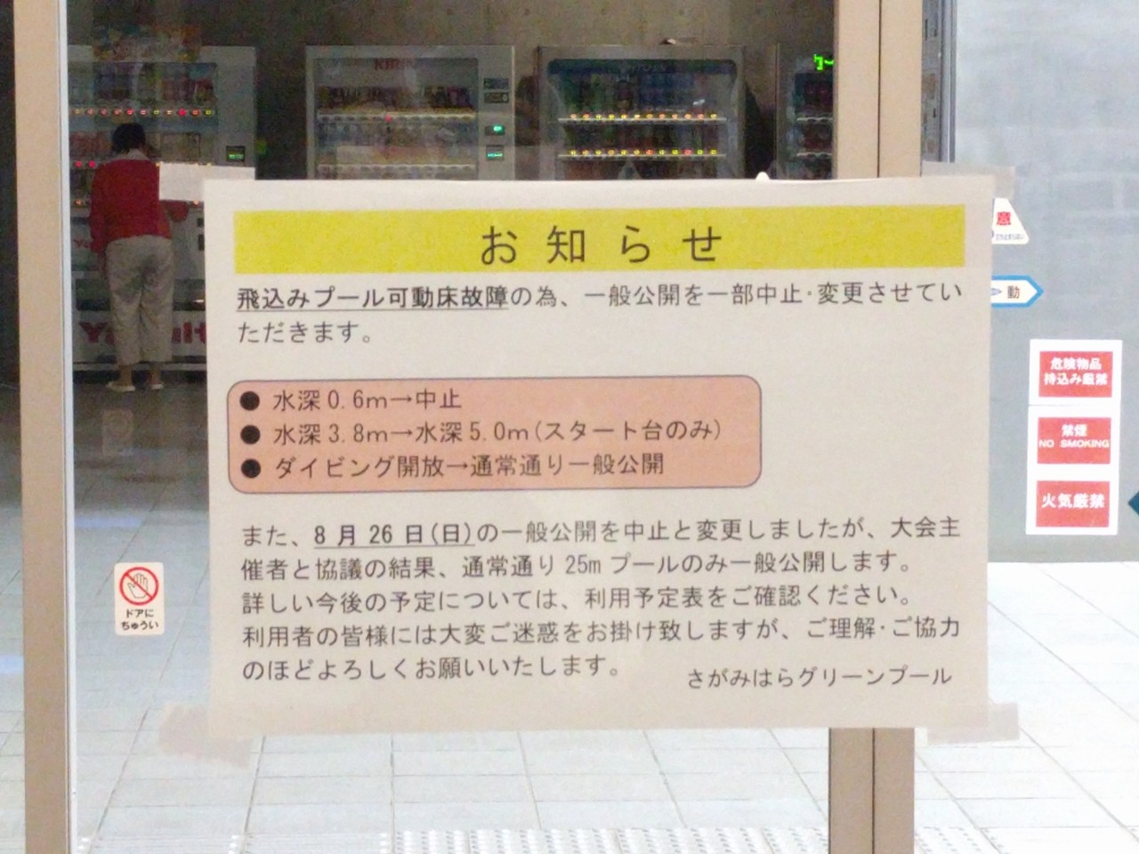 8/26の相模原市水泳公認記録会はめずらしく短水路も大会使用でプールの一般公開はまったくナシの予定だったが、経緯はわからんが短水路は一般公開することになったそうな。