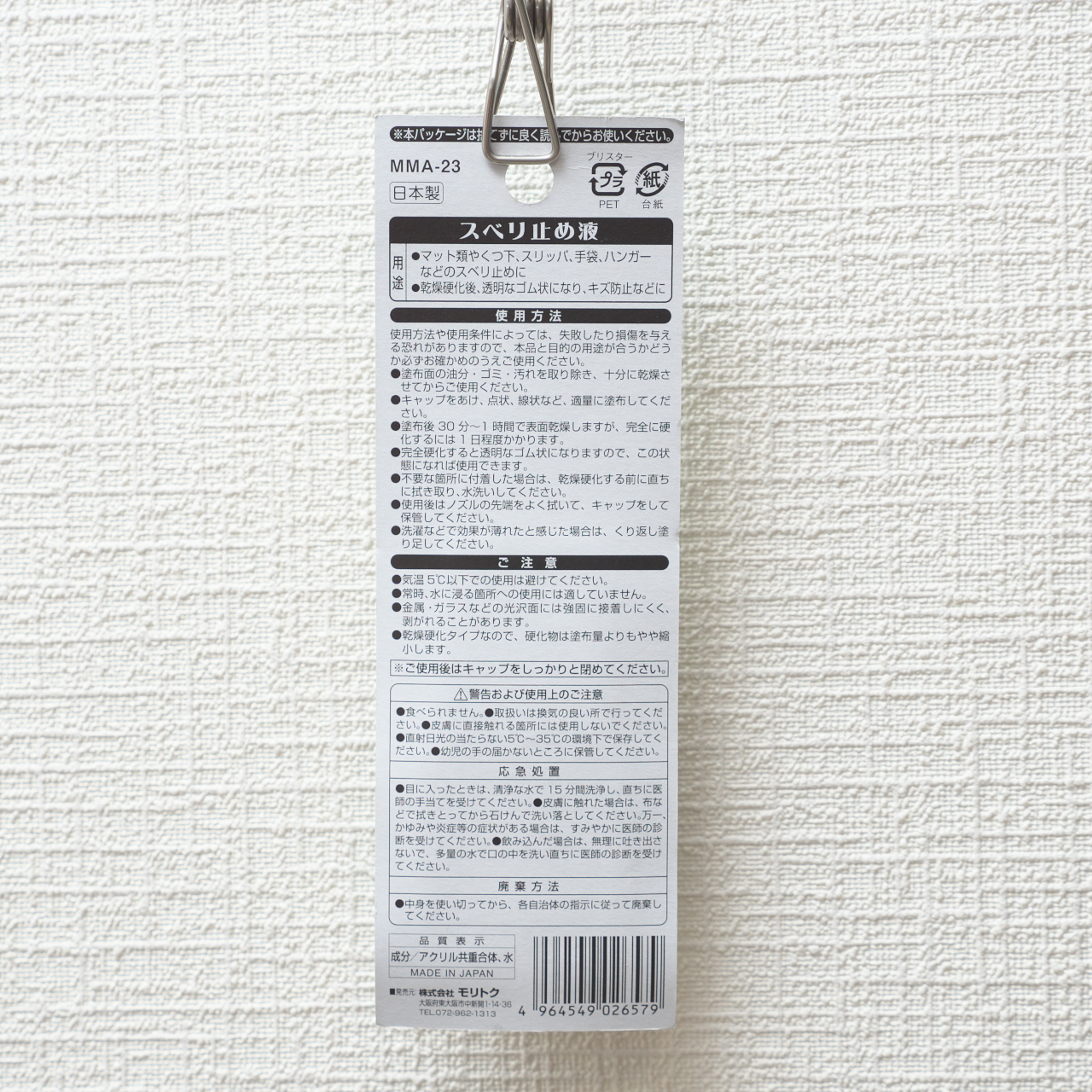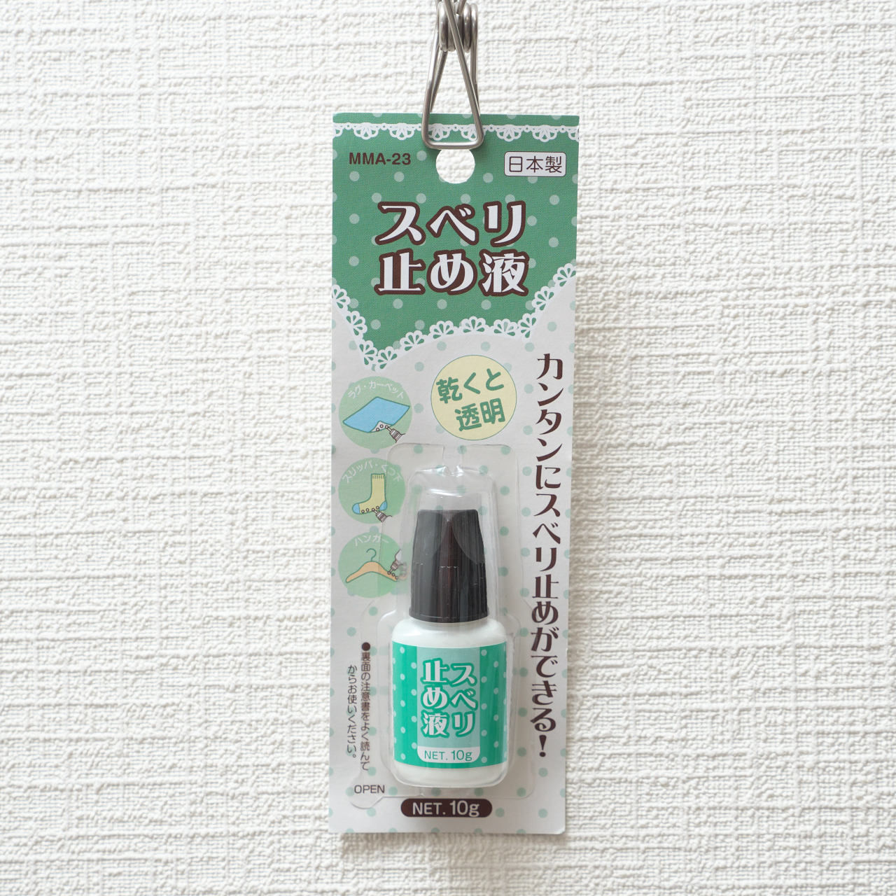 百均でスベリ止め液を売ってた。ソックスカバーが脱げてくるので踵に塗ろうと思ってたのだが注意書きを読んだら皮膚に直接触れる箇所には使用しないでくださいと書いてあったorz