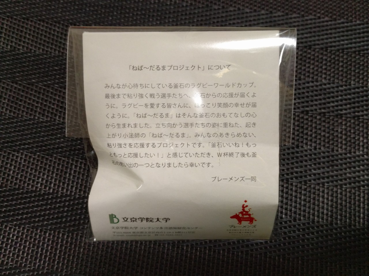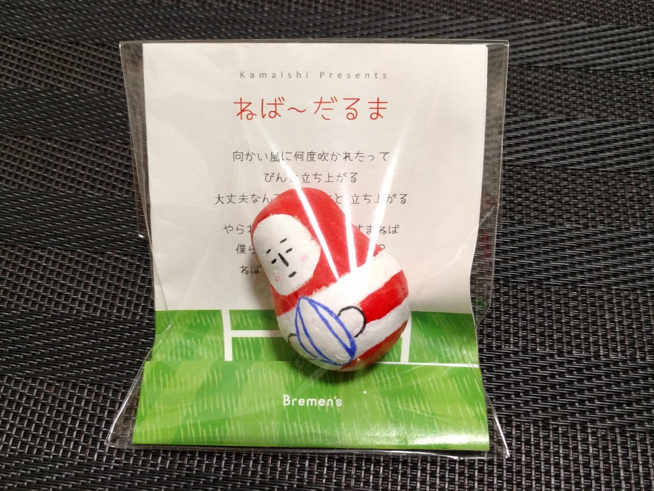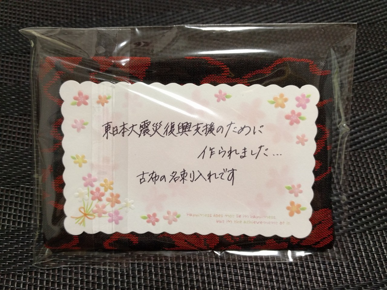 参加賞はねばーだるまという起き上がりこぼしと古布の名刺入れ。