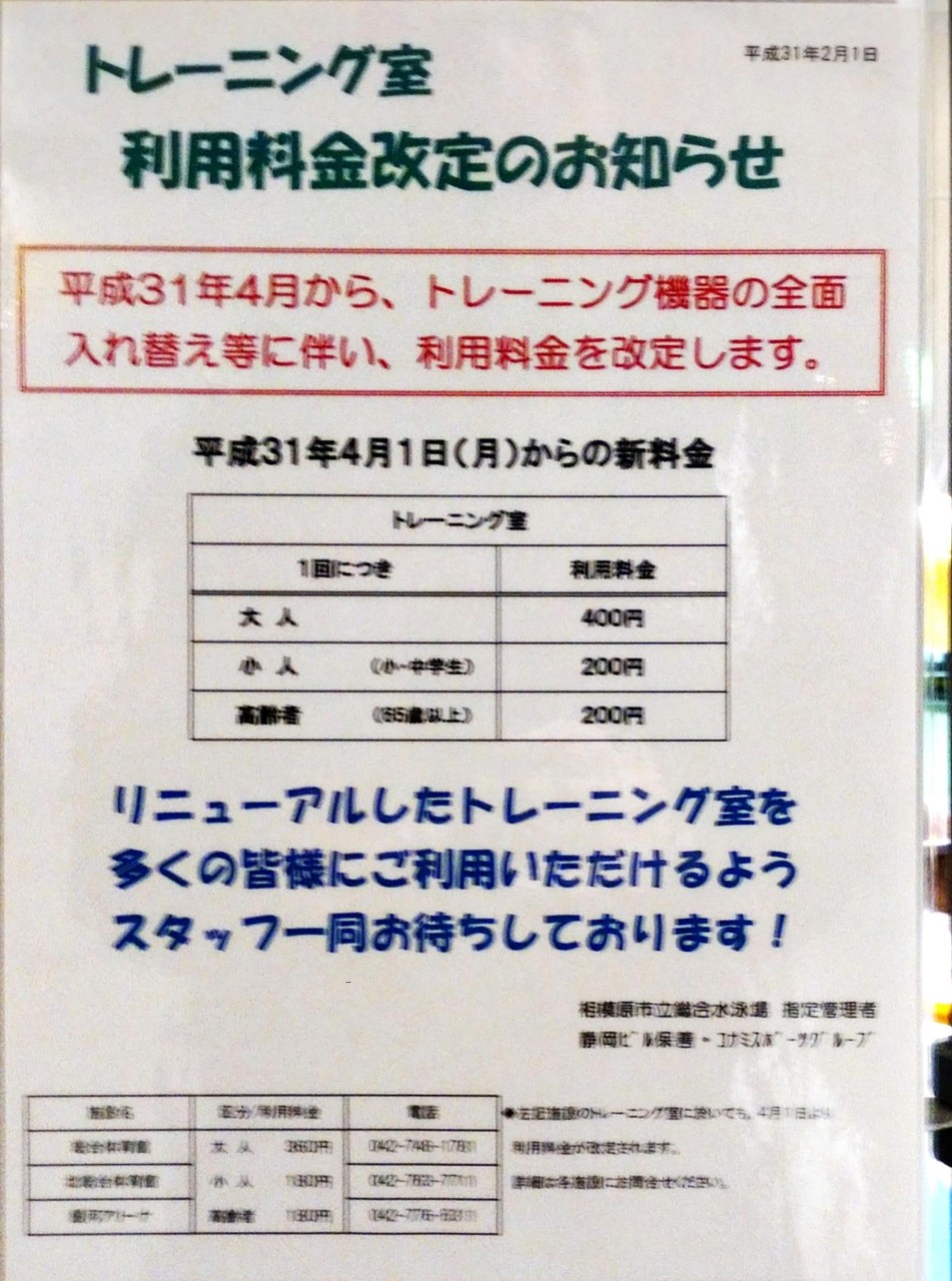 トレーニングルーム 大人260円→400円の大幅値上げ。料金は市議会が決めるそうだが、これだけ上がるということは、かなり設備更新されるんだろうか。