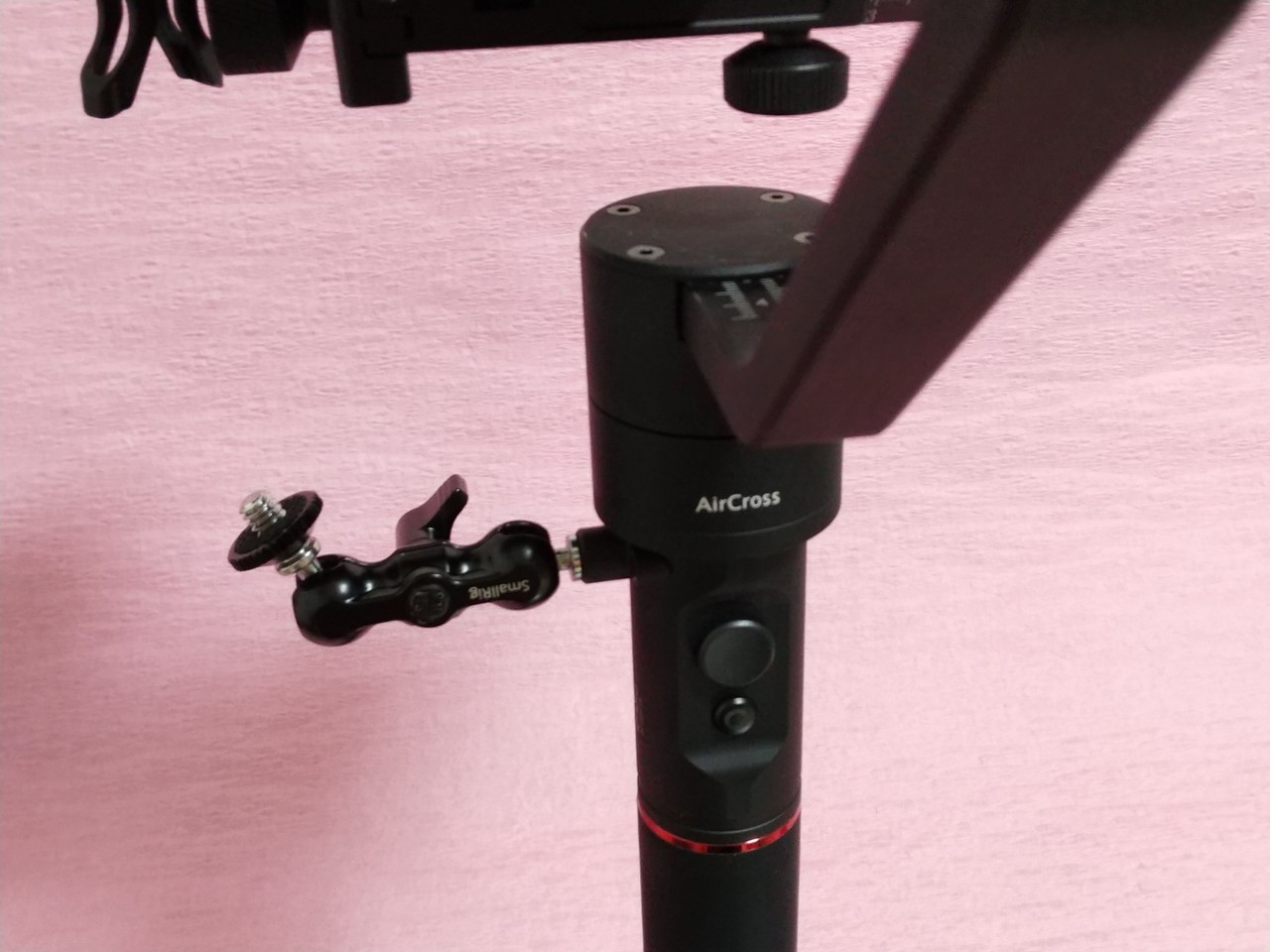 MOZA AirCross→SmallRigアーム→ホットシューアダプタ→BOYAショックマウント→DR-07とつないでみたら、AirCrossのベースプレートとDR-07がぶつかってしまうことがわかった。事前に高さ計算しておくべきだったな。。。
