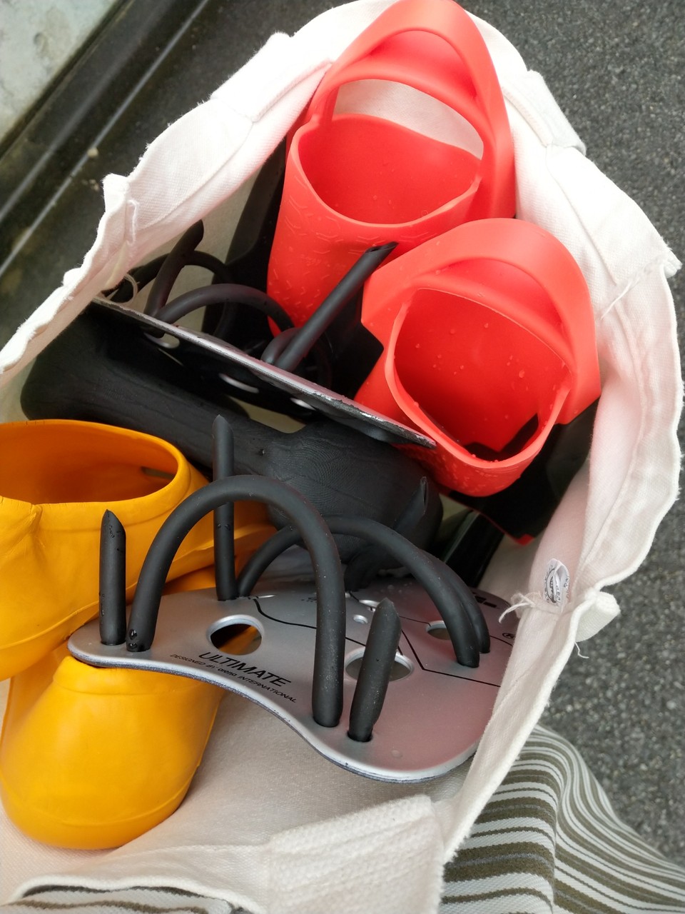 フィンは水にちょっと水に浮く。はきごこちは足にぴったりフィットして靴擦れはしなかった。つまさきの水抜き穴はフィンをはいたり脱いだりするときには意味があるが、泳いでいるときは水の出入りはない。とりあえず、股関節まわりの筋肉がひどく疲れている。あしたは筋肉痛だな。