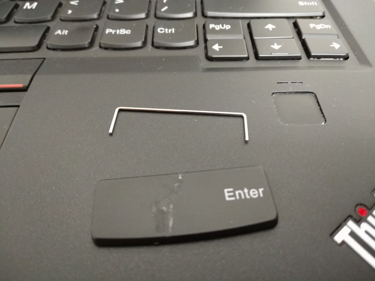 つづいてEnterキーの掃除。おなじように外すとパンタグラフが2つに分かれていた。事件はキートップを拭き掃除しているときに起きた。おてふきでキートップを挟むようにして拭いているときに、ちょっと曲げるような力を入れたときにパキっとまっ二つに割れてしまった。もっと丈夫な素材だとおもっていたが顕微鏡でつかうカバーガラスなみに弱い。まじで弱い。薄皮煎餅よりも弱い。ちょうど真中で割れたが、キートップの構造的には縁の部分がリブになっているだけで中央部はただの平面。よくこれで Enter キーがつとまるなぁとおもうほど。
