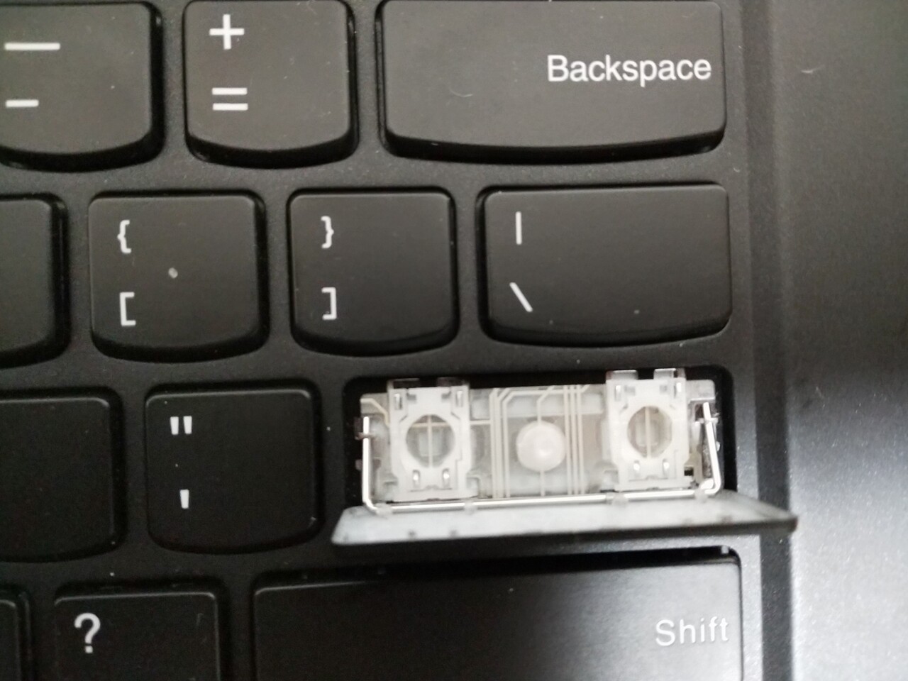 一番感触が悪い \ キーを外す。四隅を順番に爪でひっかけてゆっくり引っ張り上げていくとパチっと音がして外れた。この小さなキーにスタビライザーの金具がついててびっくり。パンタグラフの軸にワインの赤がみえるのでコンビニ弁当についてくるおてふきで拭き掃除。パーツが壊れるといやなのでパンタグラフは外さずに。スタビライザーの金具と、本体側の金具を滑らせる場所拭き掃除。
