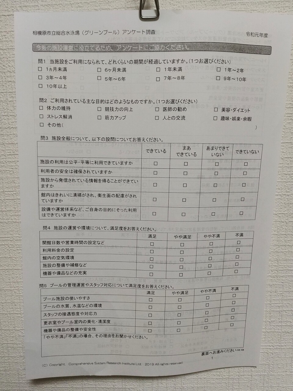年末にプールに行ったときにアンケート用紙を渡されたので記入してもっていったら粗品くれた。