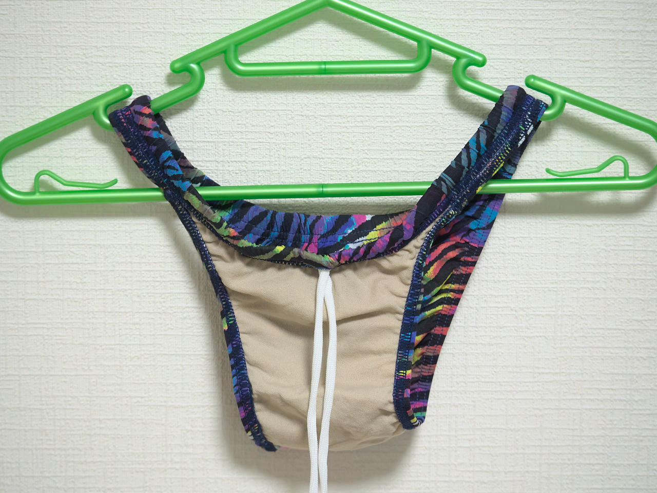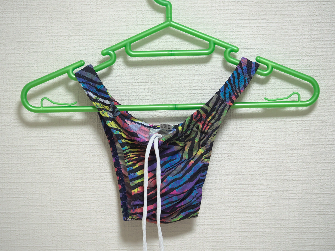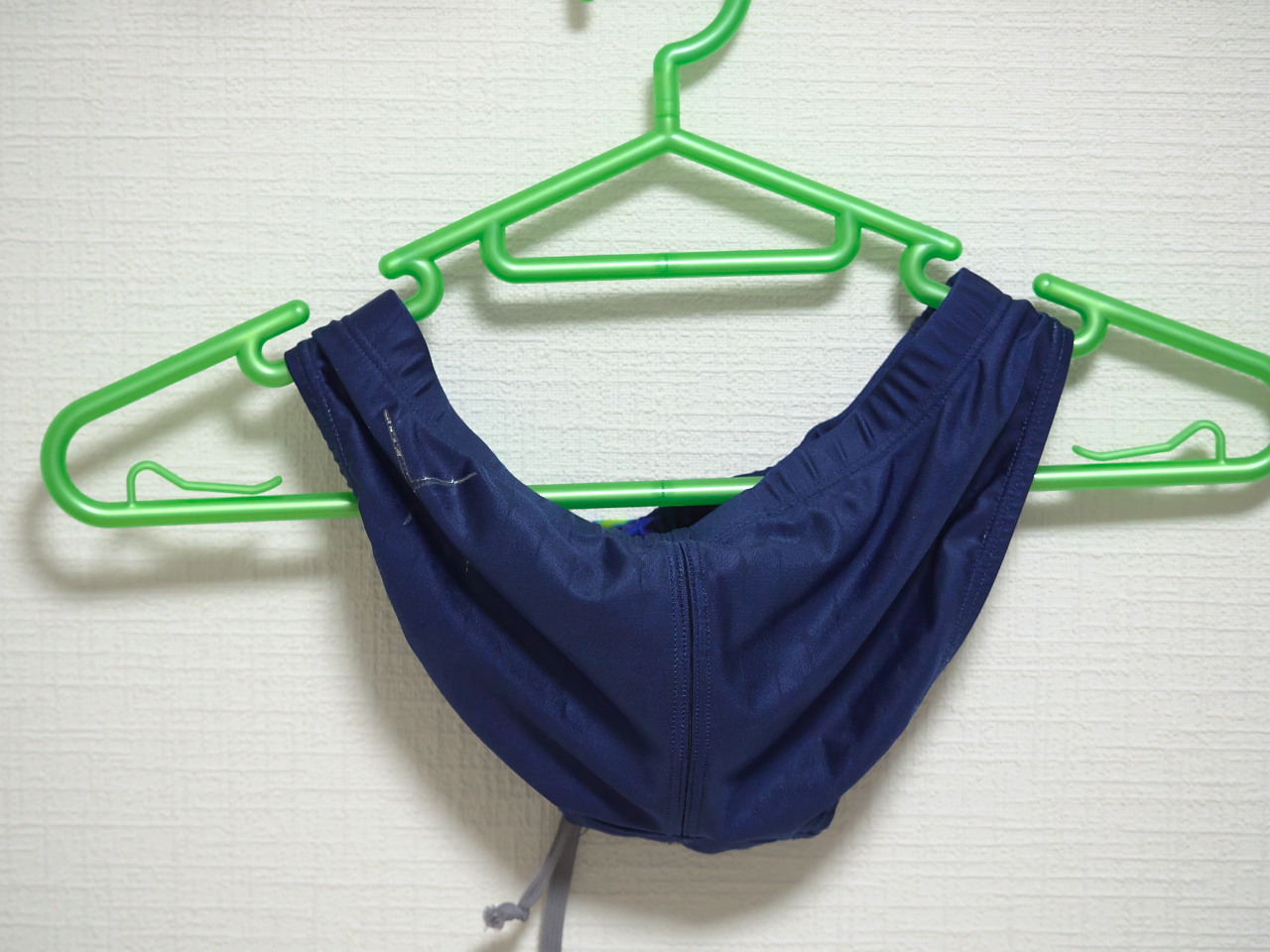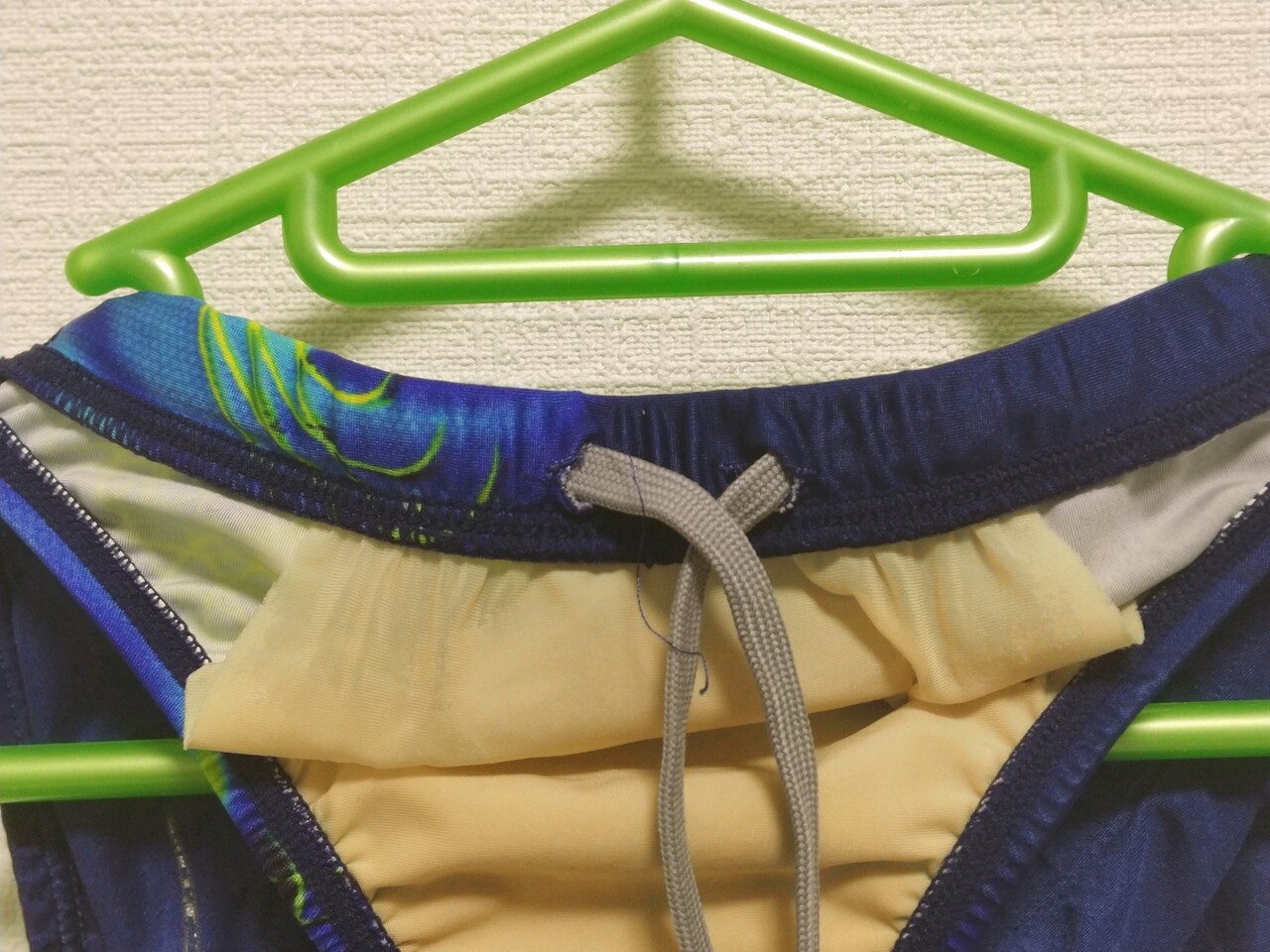 腰ひもが1つの穴から両端が出てるので結び目がほどきにくいかも。ふつうの競泳水着だと穴が2つに分かれているので一重結びが簡単にほどける。