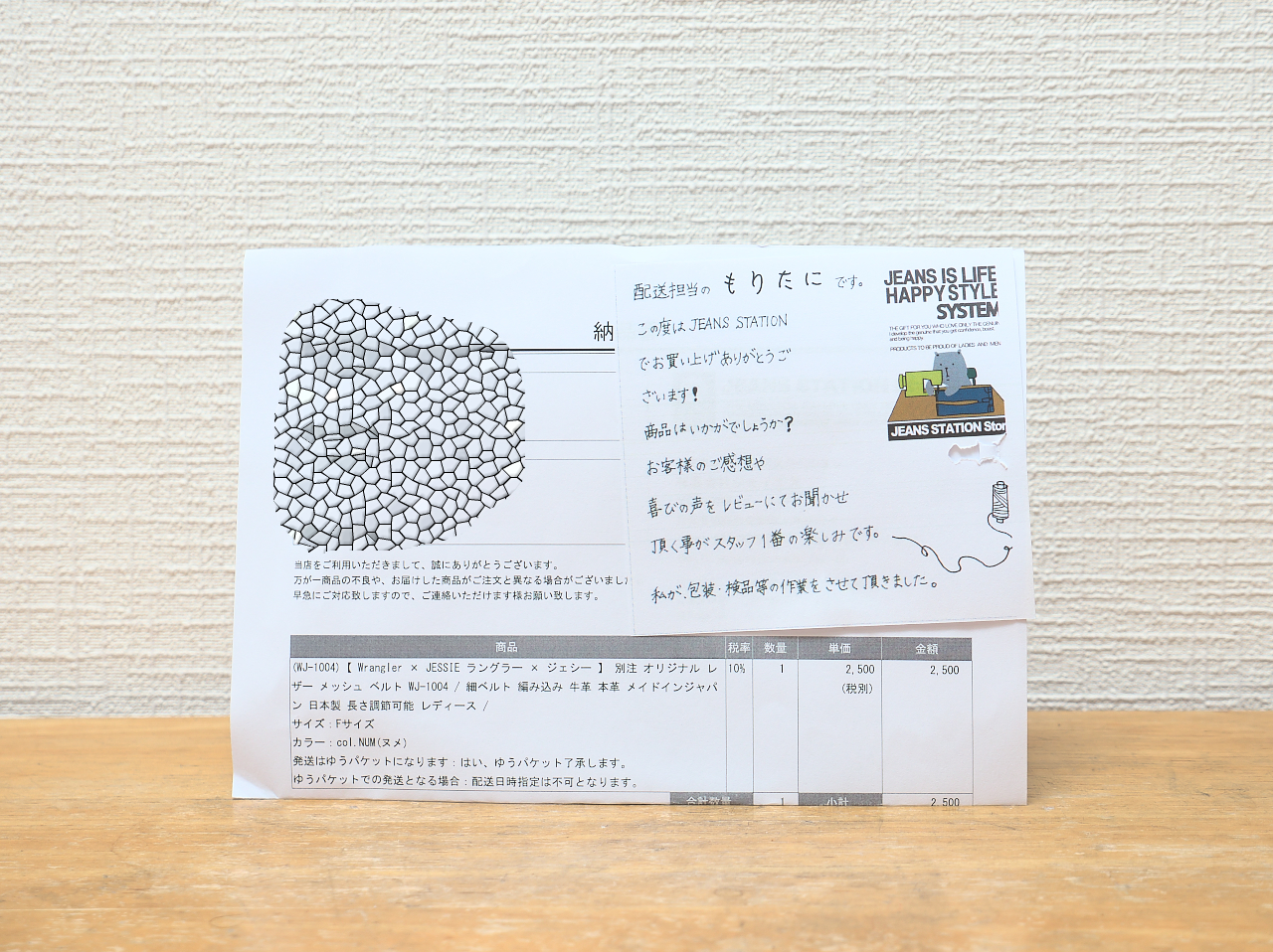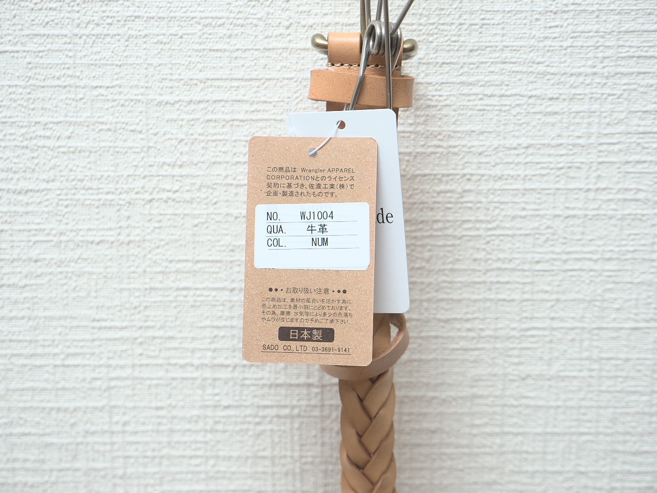 メッシュベルトをさがしてたらWrangler×JESSIE オリジナル レザー メッシュ ベルト (WJ-1004)にヌメ革があったのでポチってしまった。どうやら2015年夏くらいから売ってる商品のようだ。2500円+消費税(10%)。送料無料。