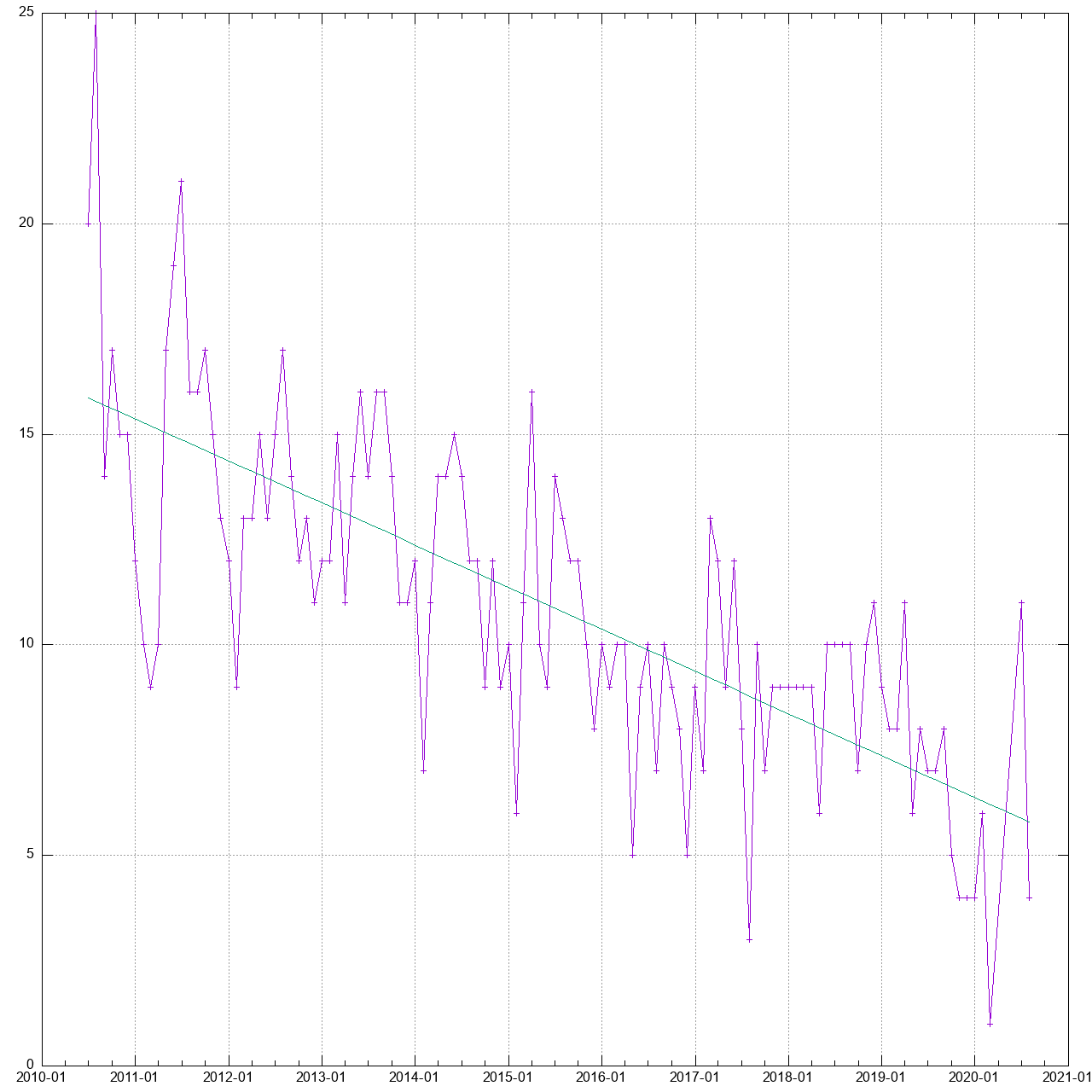 #set term sixel size 1600,1024 set term png size 1280,1280 set output 'count.png' set xdata time set timefmt "%Y-%m" set format x "%Y-%m" unset key set grid f(x)=a*x+b a=-10 b=200 set fit prescale set fit limit 1e-12 fit f(x) 'tmp/count.dat' using 1:2 via a,b plot "tmp/count.dat" using 1:2 with linespoints, f(x) with lines pause -1