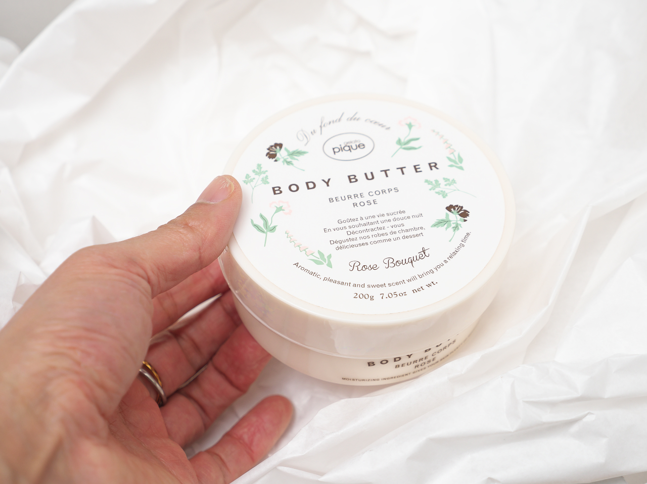 ピンクはローズブーケ、ラベンダーはピオニー(牡丹)ブーケの香りとのこと。見た目はやわらかめのクリームでテクスチャはやわらかでみずっぽい。使う量にもよるとおもうが、けっこう香る。甘さひかえめ。1540円。