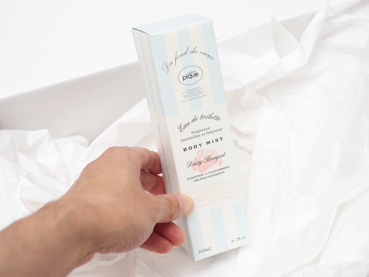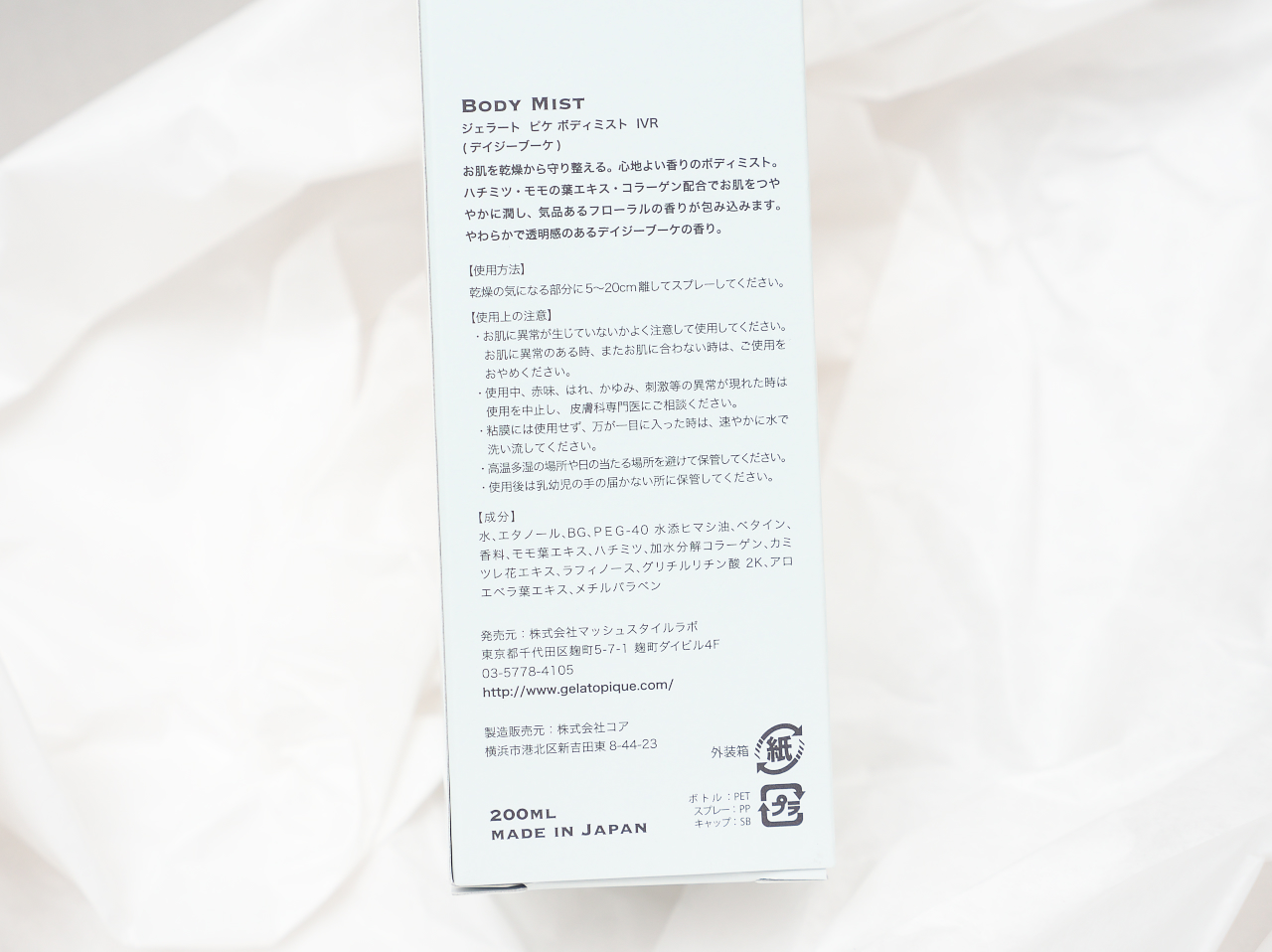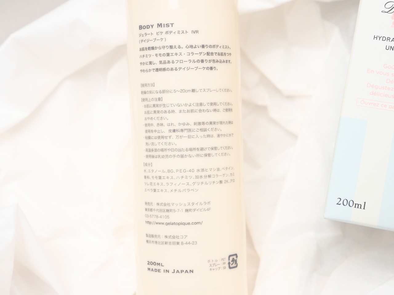 instagram coloria_magazine ボディミスト人気ランキングBest10をみてジェラートピケ ボディミスト ピンクがお手頃そうだったので公式サイトをみてみたらピンクはちょうど売り切れでアイボリーが安くなってたので買ってみた。送料無料にするために余計なものまでかってしまった(数日後、1日限定の送料無料の日の案内がきてショックだったけど)。