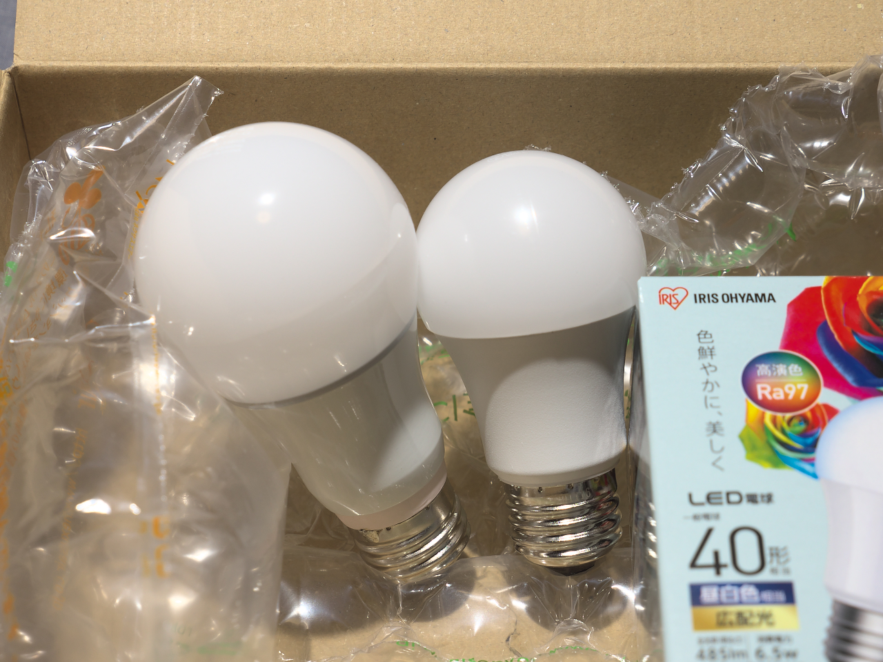 2年前に買った東芝電球型LED LDA9L-D-G/LDA9N-D-Gと比べると小さいし軽い。技術は進歩しているのだなぁ。色はぱっと見、違いがあるようには見えない。さすが高演色なだけある。