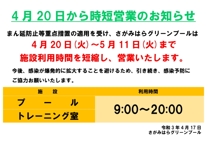 相模原は4/20からまん延防止等重点措置が適用されるので、プールは時短営業になるようだ。休業じゃなくてよかった。