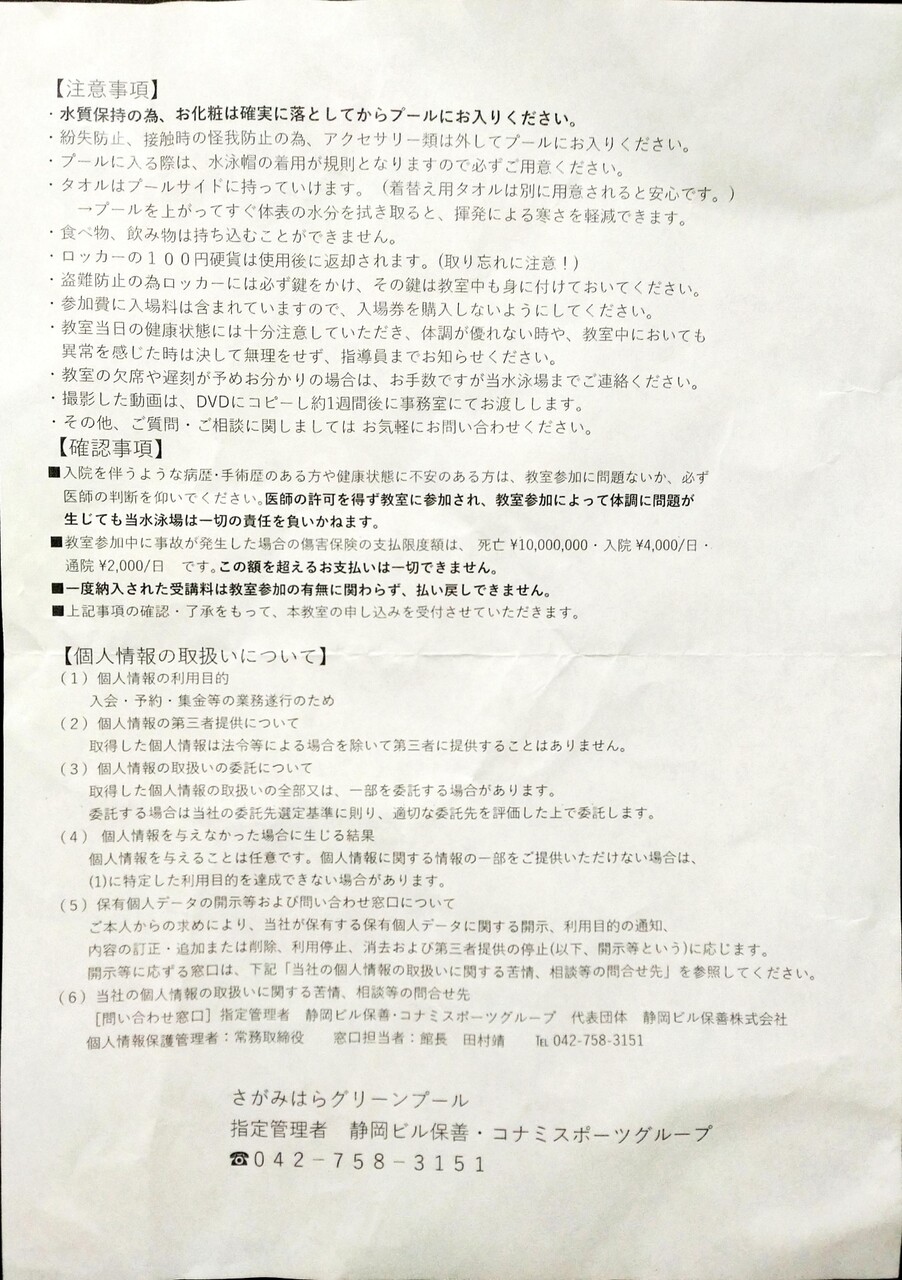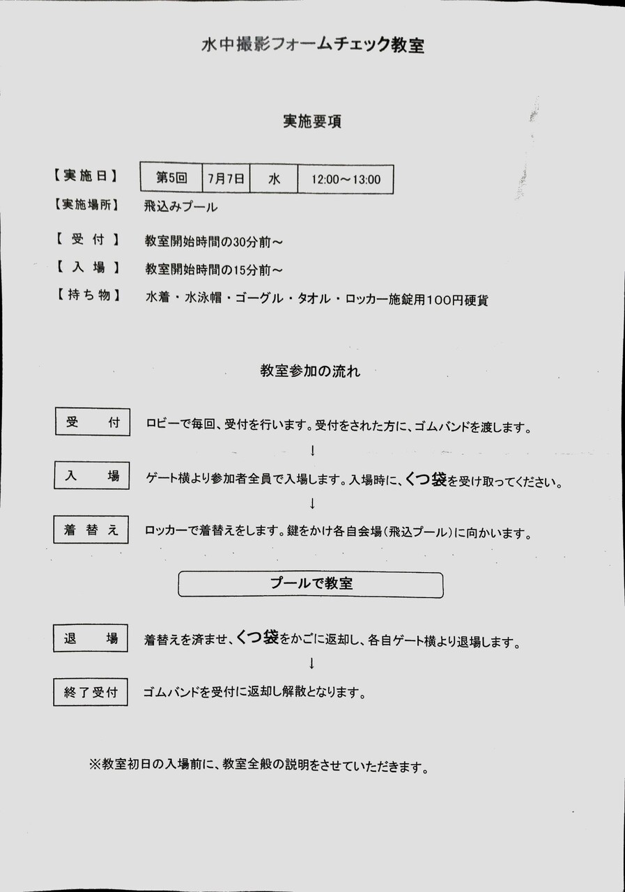 前日に泳ぎに行ったときにプール内の掲示板に募集の紙が貼ってあるのに気づいたので(迷ったけど)申し込んだ。目的はもちろん自分の背泳ぎをみるため。あとで確認したらグリーンプールのページの主催事業のところに掲示されていたが、一番下だったので気づいてなかった。エントランスホールの掲示板はチェックしてたんだが、こっちにはのってなかったのだった。