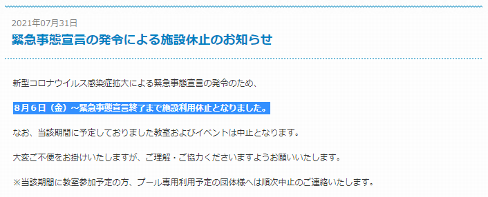 8/2からの緊急事態宣言をうけて8/6からグリーンプールはお休み。小倉(こだま)プールも。町田市は営業するし、相模原市も近所と足並みそろえてほしいなぁ。