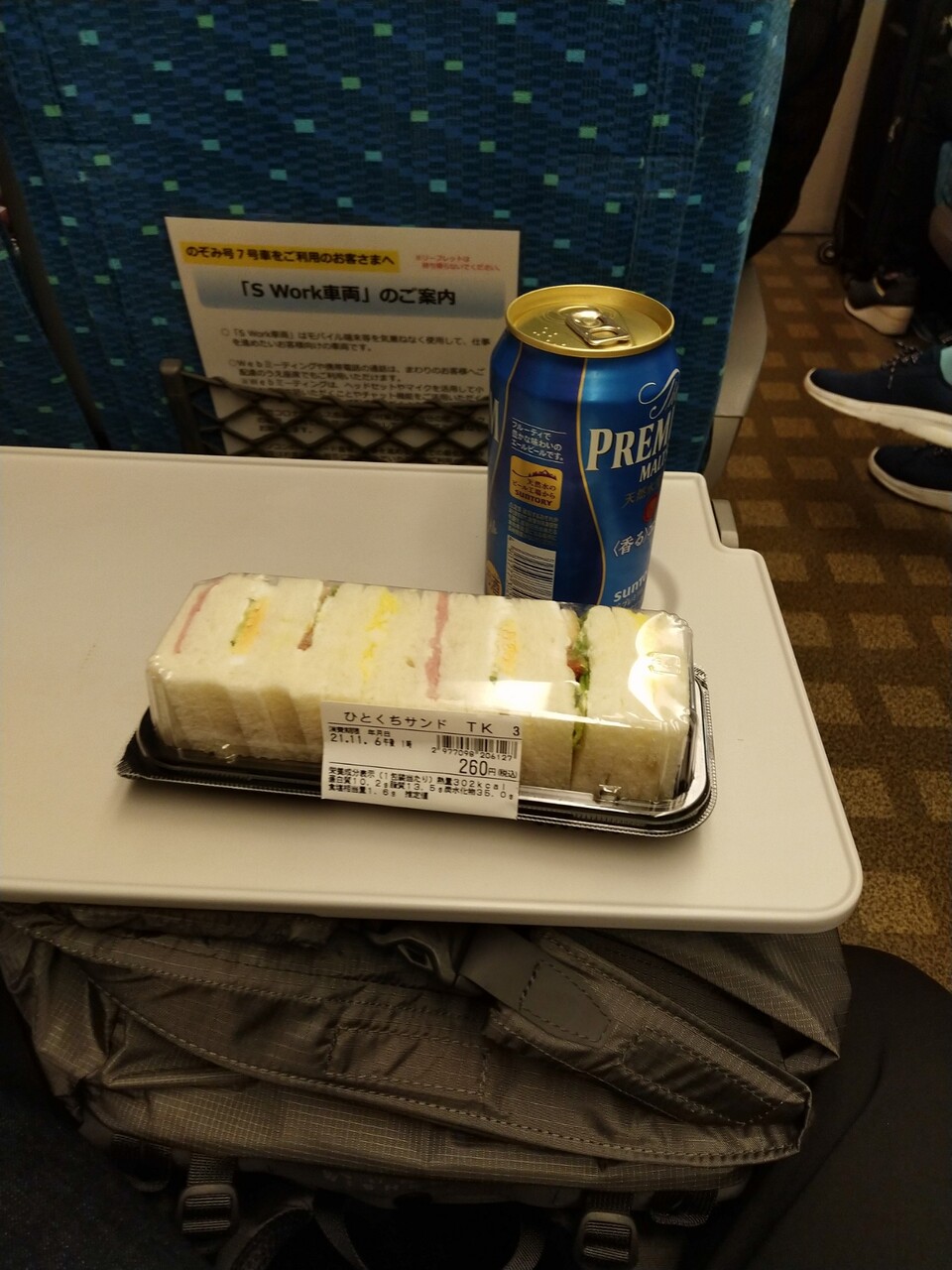 これは朝の新幹線で(時間がなくて朝食を食べずに家を出たので)朝食用のサンドイッチと香るエールプレモル。