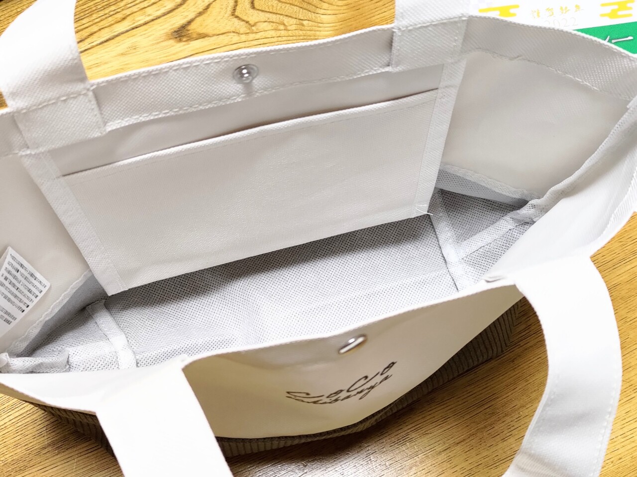 下半分のコーデュロイ部分は裏側が不織布で補強されている。上半分の白い部分の裏側はポリウレタンコーティングされている。端の始末も不織布で袋縫いになっていてなかなか手が込んでいる。