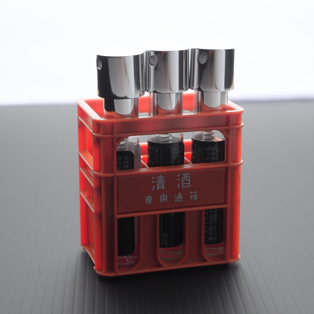 アトマイザーにはいった香水。ちゃんとラベルがはってあるが字が小さいので読みにくい。使いかけの香水がたまってくると分かりにくいな。