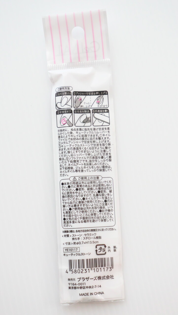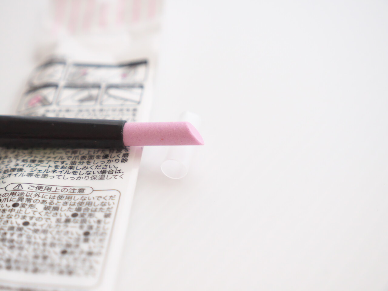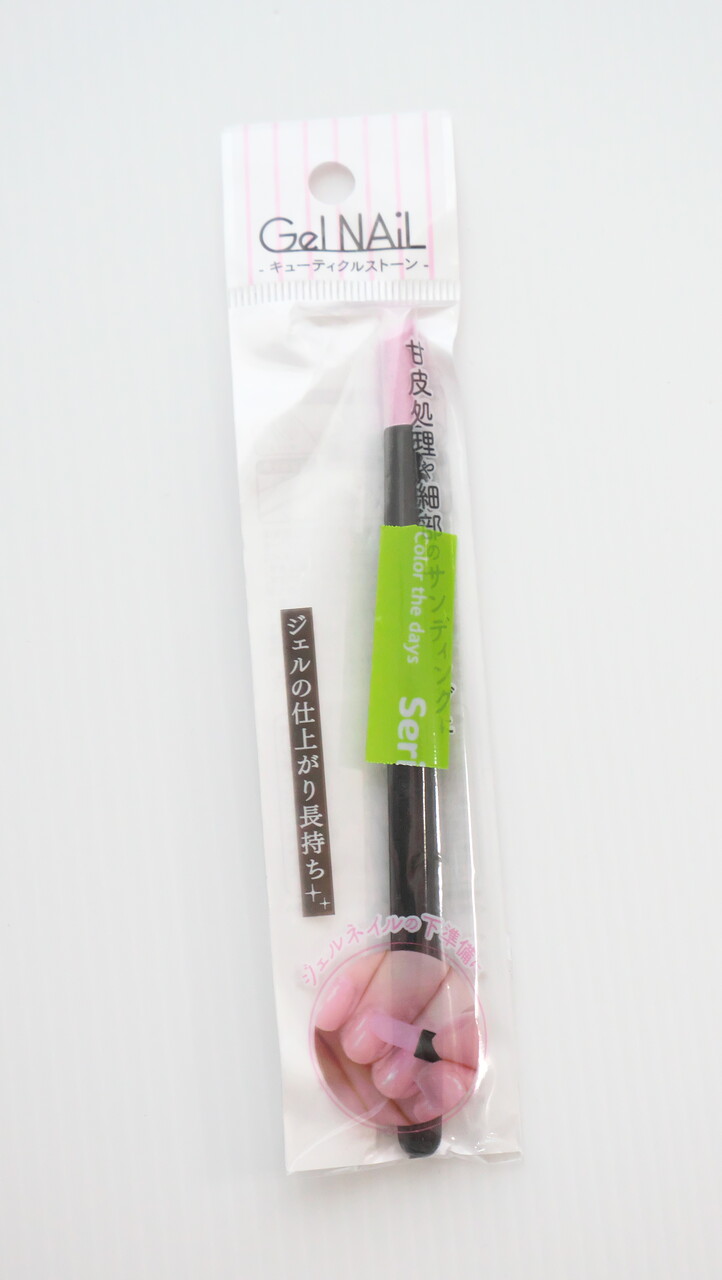 メタルプッシャーで甘皮まで押し上げようとすると爪にキズが入りがちなので、メタルプッシャーは生え際を上げるだけにして、爪に残った甘皮をこのストーンでくりぐり削るときれいにとれる。ついでにサンディングまでできちゃうし。