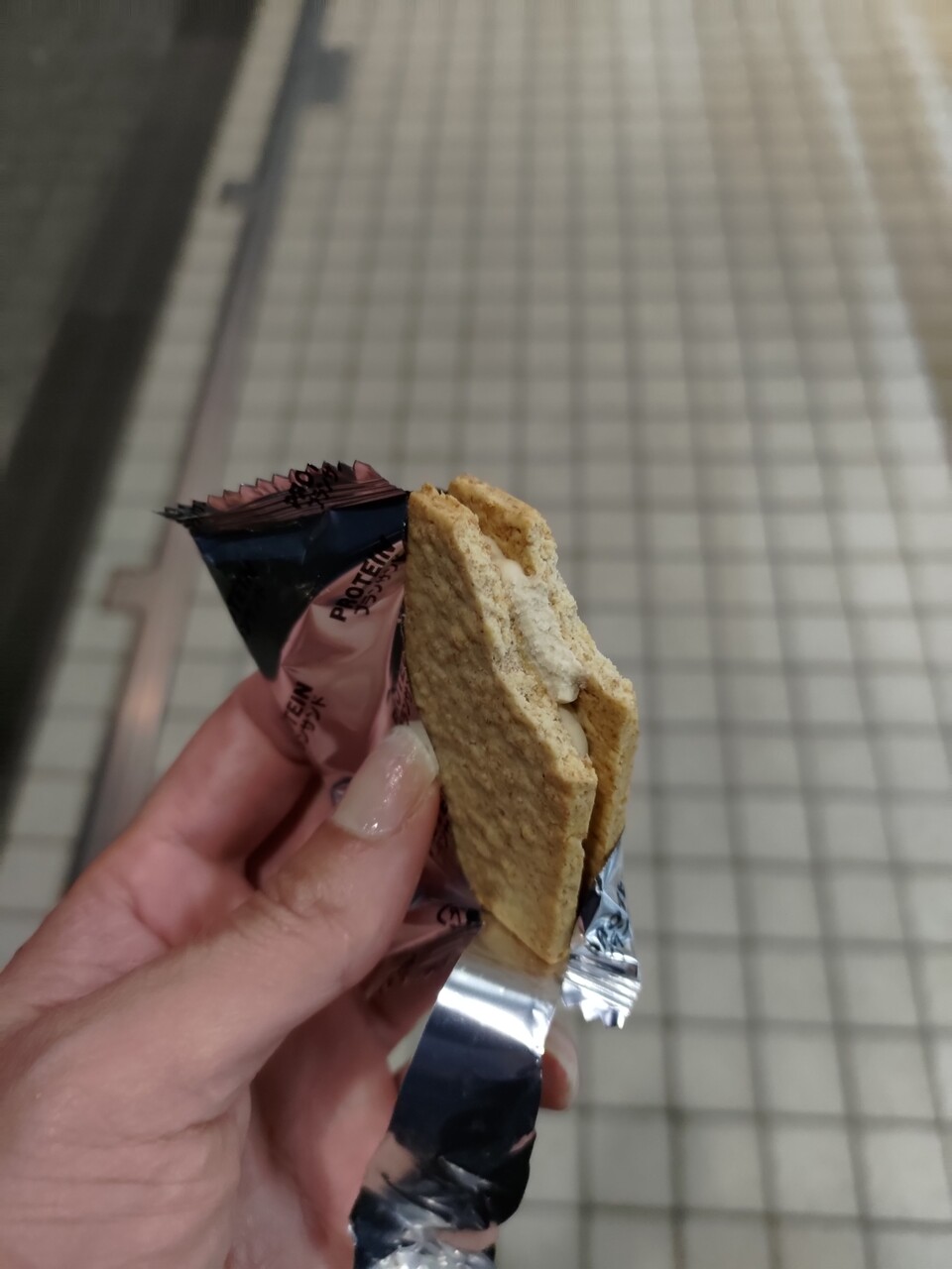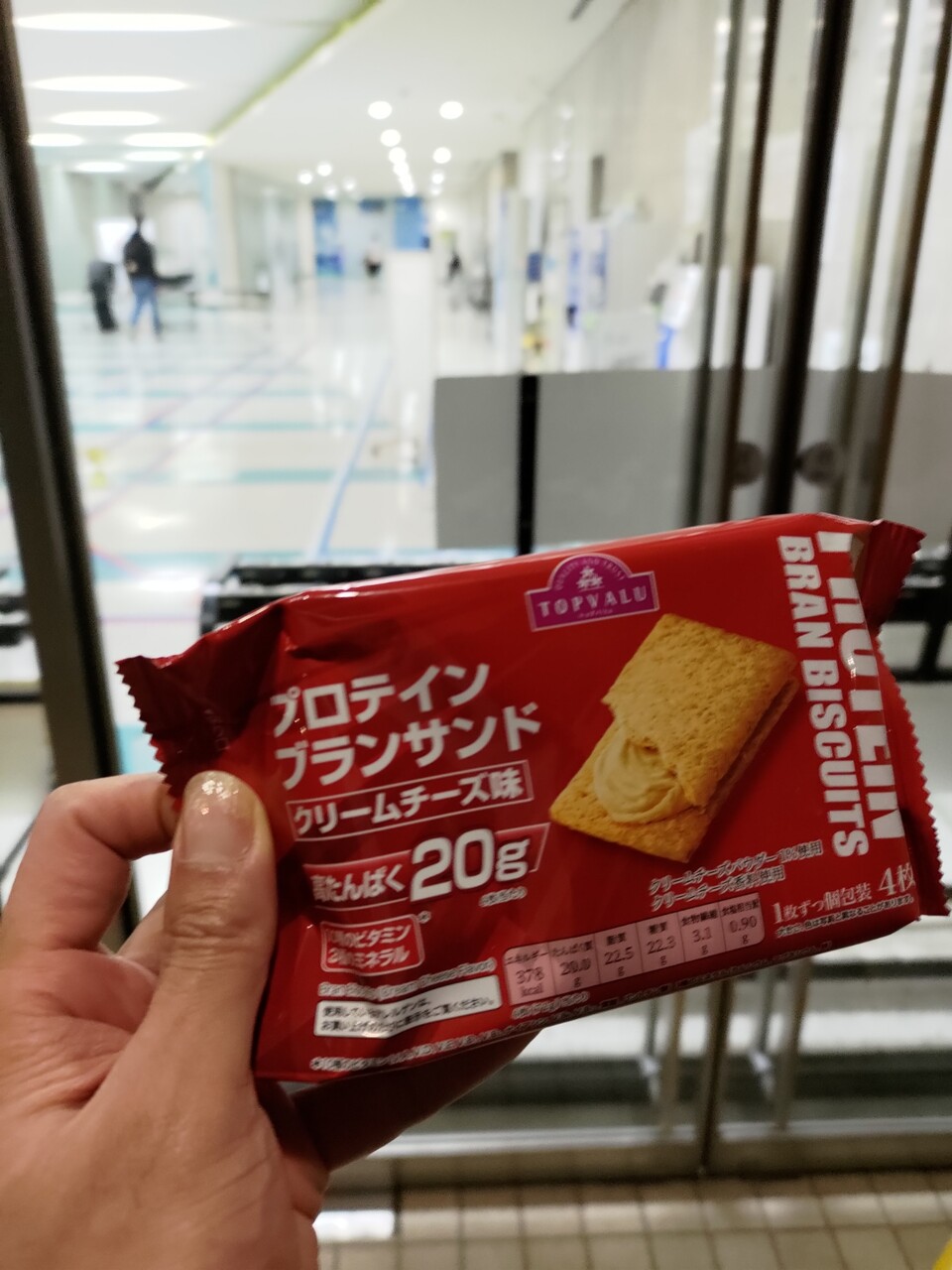 プールから上がった後の補食はTVプロテインブランサンド。おそろしくパサパサで口の中の水分が全部吸い取られた。大量のドリンクが必要。