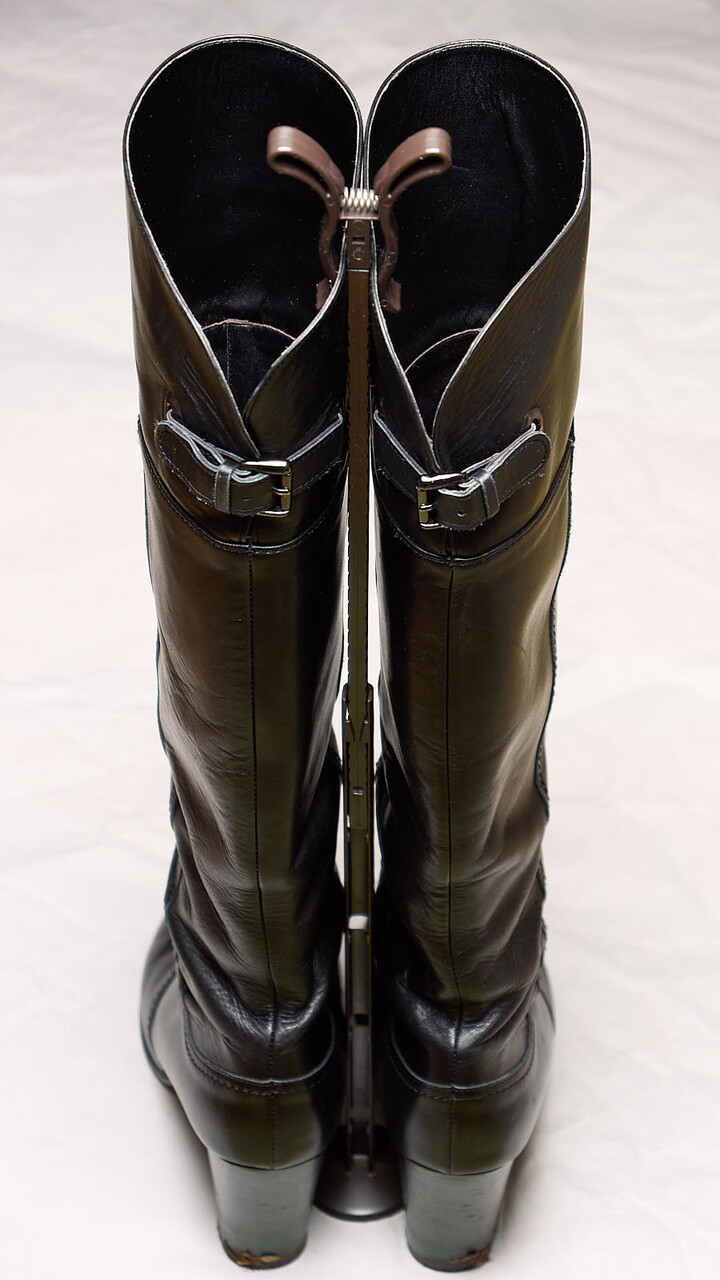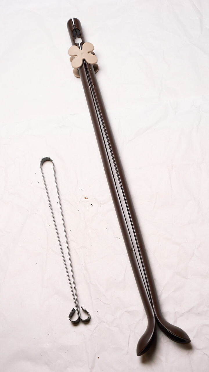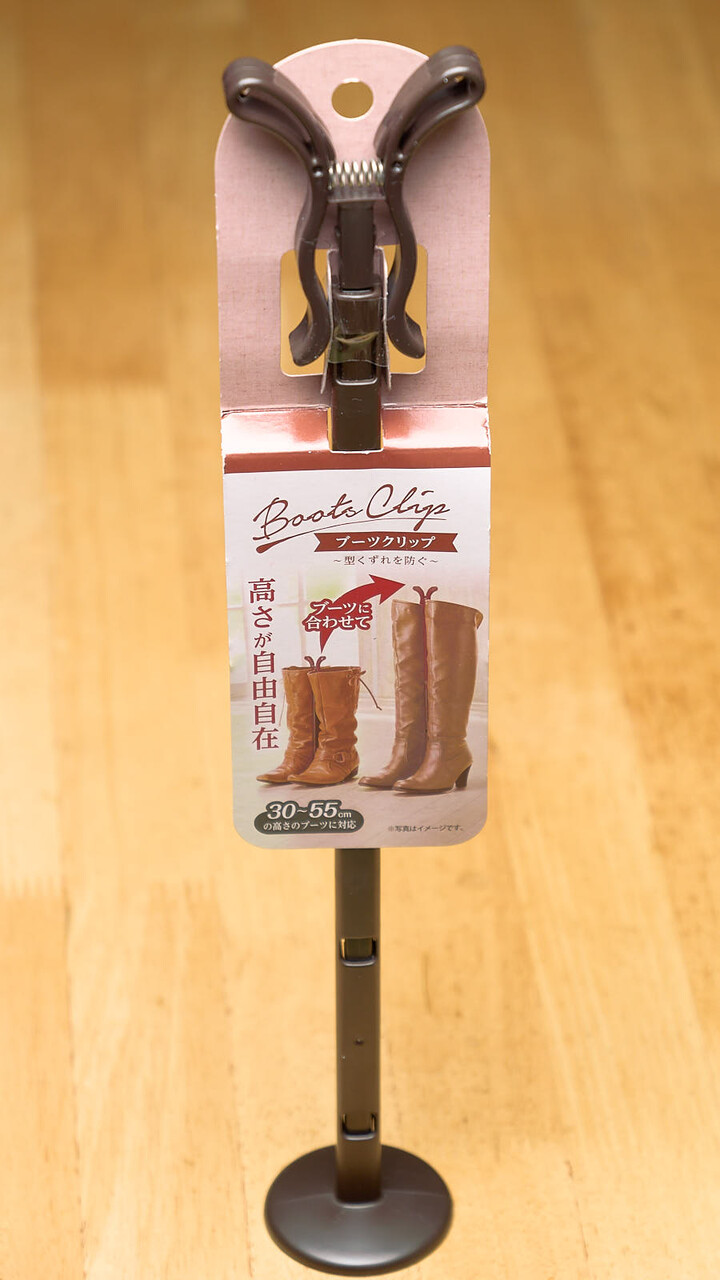 靴底からの高さが50cmあるロングブーツでも余裕で対応できたのはよいが、クリップの底面の円盤がけっこう邪魔。これまでのクリップは靴を手でおさえておいてクリップの抜き差しをすればよかったのだが、今回のは靴が揃った状態だと円盤が靴につっかえて抜けないために一度靴を放さなけれならないがそれは靴が倒れることを意味するわけで、ちょっとなしかな~