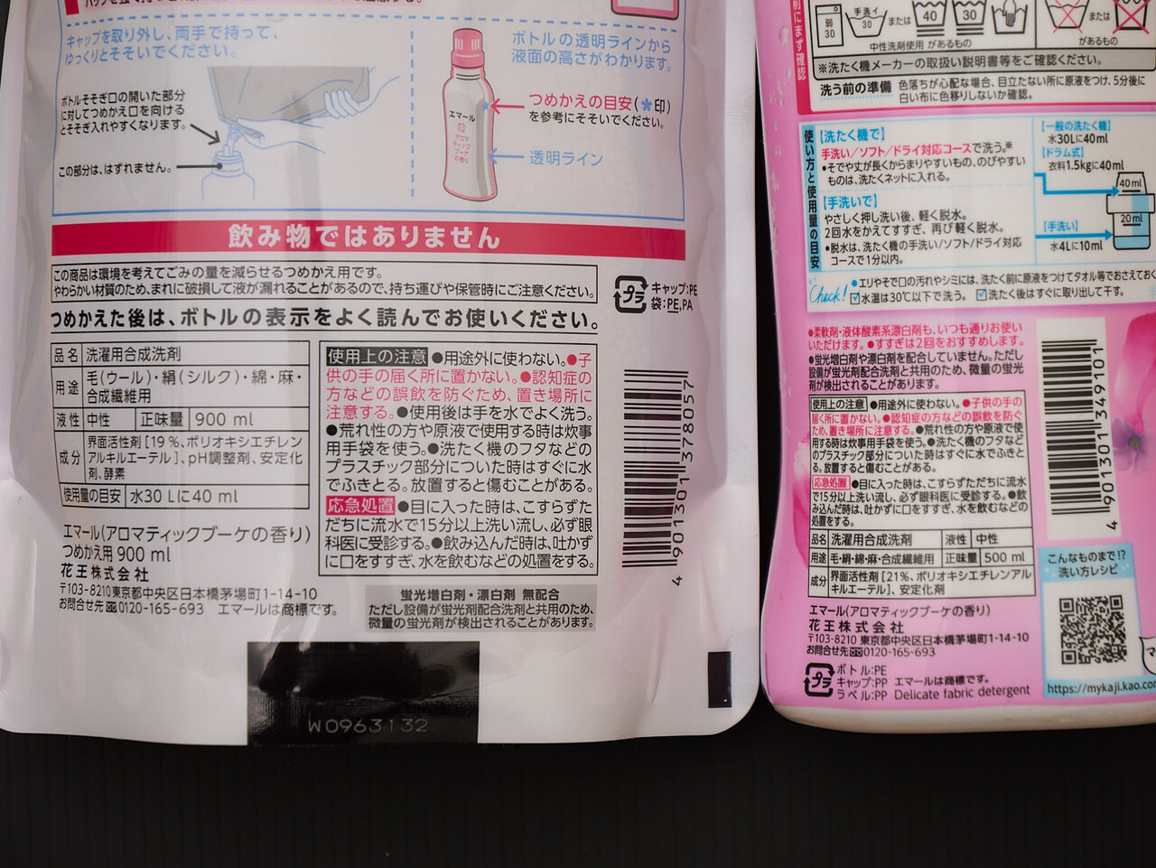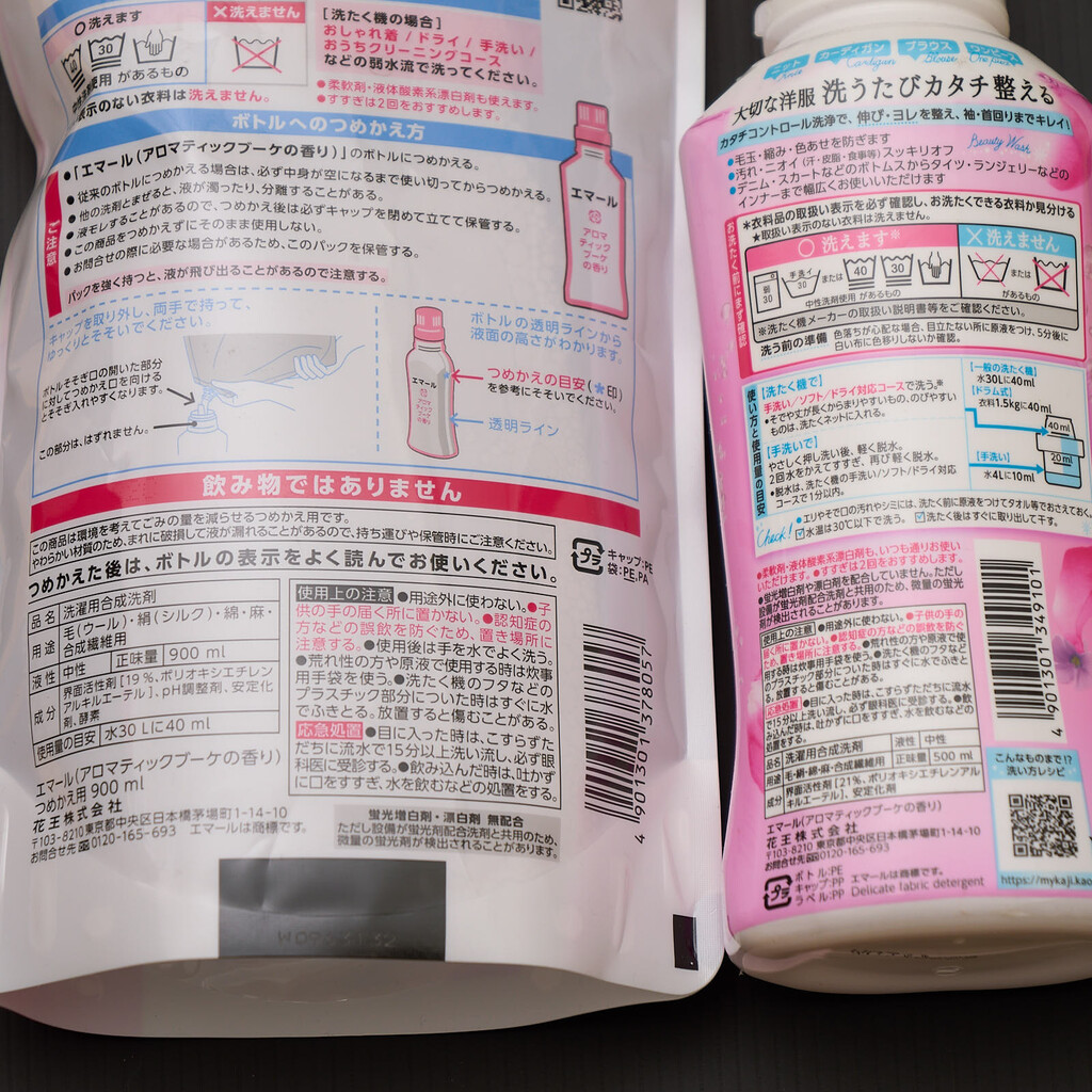 1世代前のエマールとは成分がちょっと違ってて界面活性剤が減って酵素が追加されてた。香りも甘い香りからちょっと爽やかさが追加されたように感じた。成分では安定化剤が相当するとおもうがダメージリペア技術が追加されてセンイを内側から補修されるらしい。きっとシリコン系ですべりをよくしてよりを戻すってことなんだと想像。