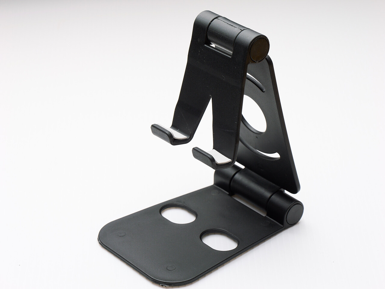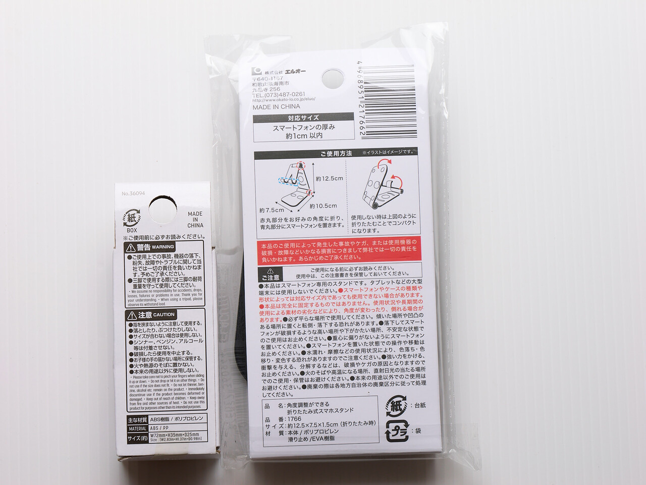 買ったもうひとつのは折り畳みスタンド型。USB端子をにがせるようになってるしスマホが滑り落ちないようにひっかかりも滑り止めもある。スマホの重心よりも前に底面がのびているので安定性もいいかんじ。角度変えるヒンジ部分もノッチがついていて緩んでくることはなさそう(使い込んだらどうなるかわからんけど)。剛性感がないのが残念だが百均だからしかたないところ。