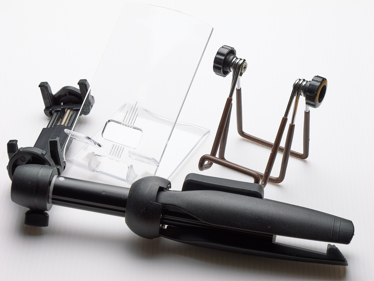 い守っているスマホスタンドは3つ。1つは自撮り棒兼スマホ三脚。透明プラのは縦置きしたときにUSBコネクタをにがせる設計になっているのがよいが、角度が変えられないのとスマホを乗せる部分がつるつるなのでちょっとしたことでスマホが滑り落ちるのが残念なところ。ワイヤータイプのは角度は自由にかえられるが縦置きだとUSBコネクタが机と干渉するのが欠点なのと垂直に立てようとすると前のめりに倒れやすい重心の不安定さ。