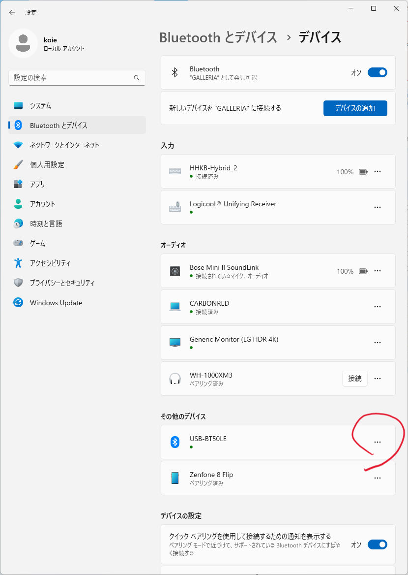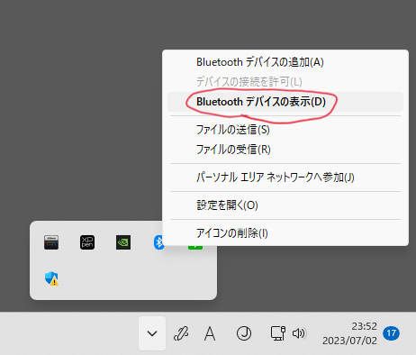 BluetoothにぶらさがっているオーディオデバイスをぜんぶアンインストールしたらタスクバーのBluetoothアイコンからBluetoothデバイスの表示を選択して