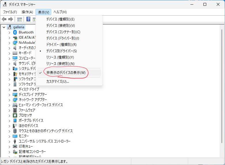 デバイスマネージャを開いて(めっちゃ自然言語はむづいなってかんじる)「非表示のデバイスの表示」にチェックをいれる。