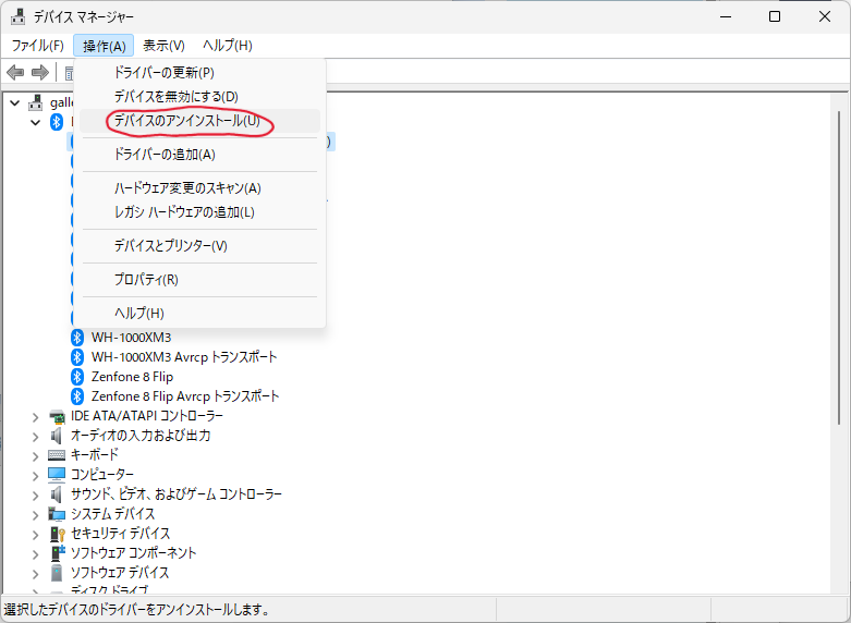 Bluetoothアダプタを「デバイスの削除」。