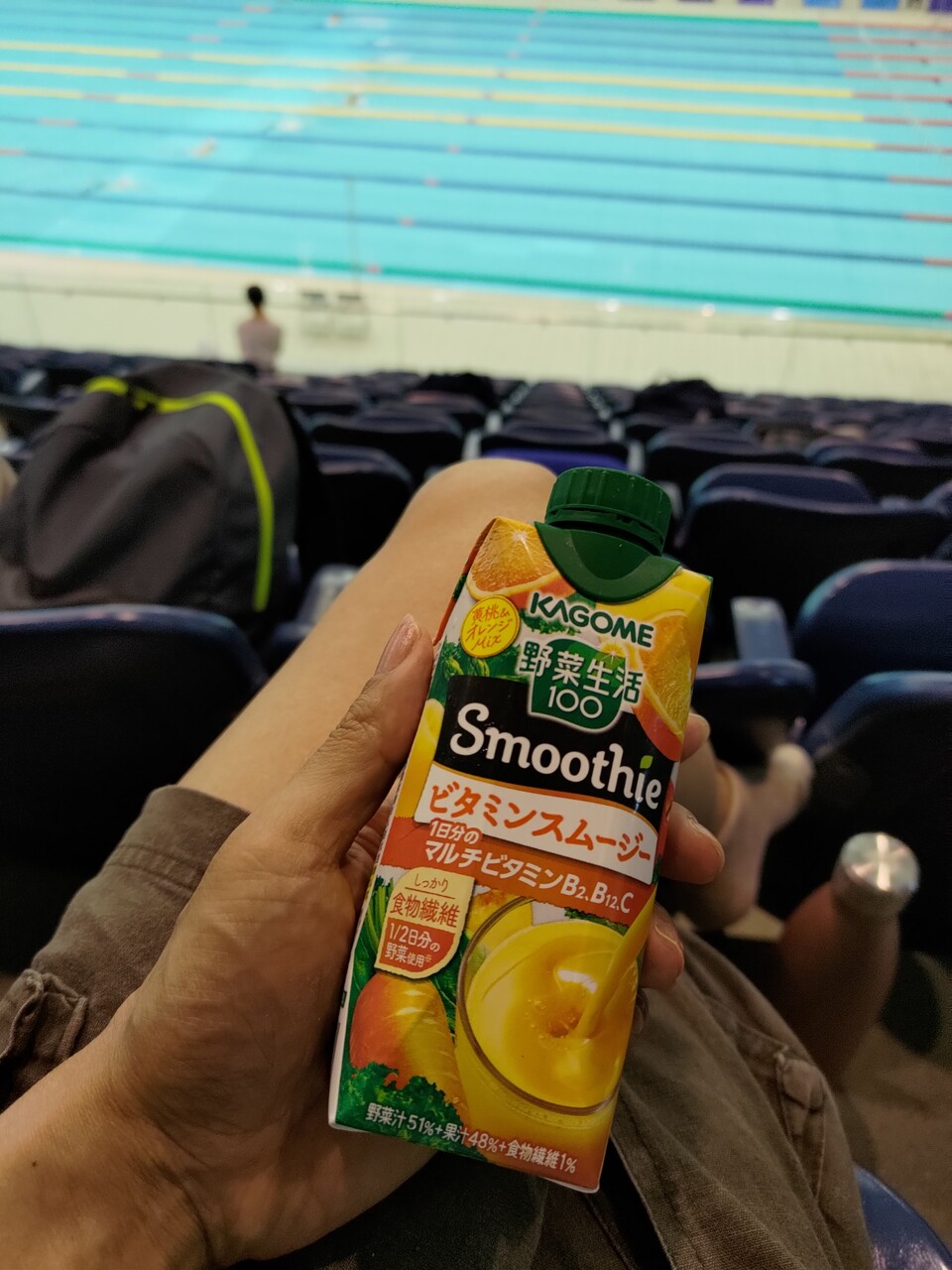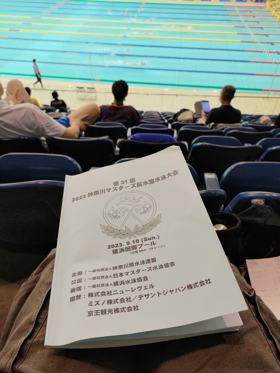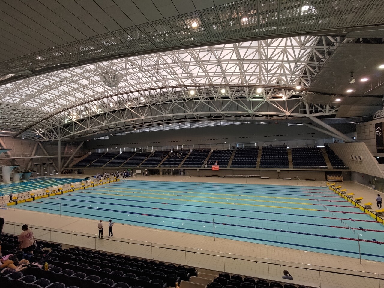 メインプールでちょっとアップして、やっぱり長水路だと疲れてしまうのでダイビングプールにうちってアップつづけて、公式スタート練習では背泳ぎのスタートを2回とんだ。