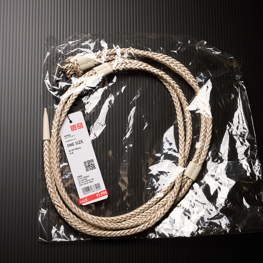 以前から気になっていたウエストマークに使えそうな革ひもベルト。ちょっと短いよなぁとおもいつつも税込1990円だったので買ってしまった。