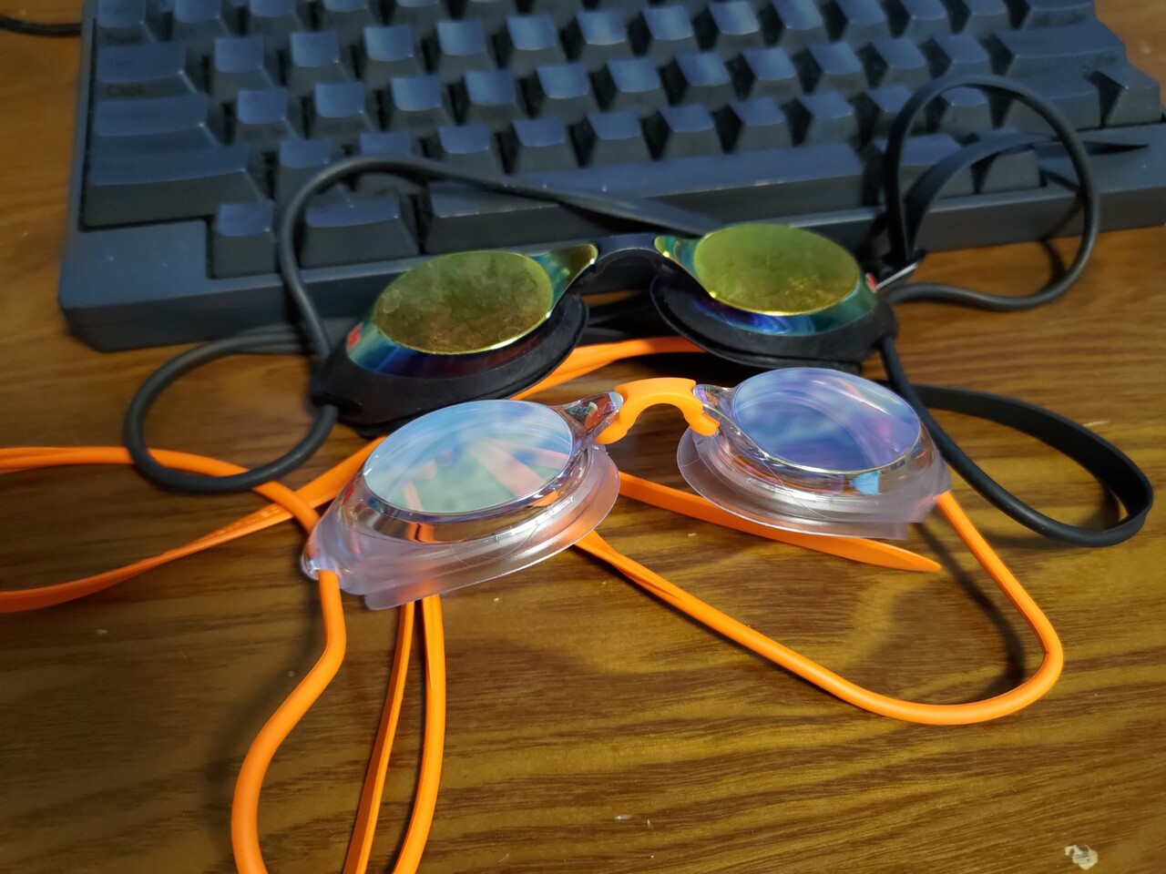 合体。やっぱ新品はきれいだなぁ。写真だと新しいイエローミラーxクリアの方が古いオレンジミラーxスモークよりも明るいように見えるけど、そんなには違わない感じ。室内プール用にスモークが薄いゴーグルがあったらいいのにな。