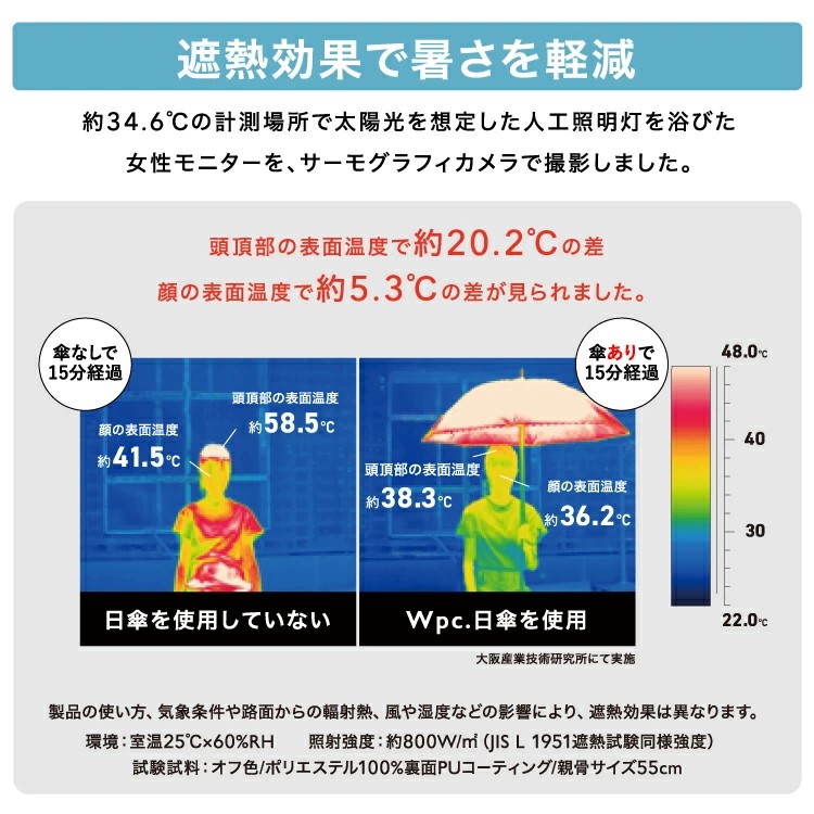 Wpc.でUV0とそうではないやつの遮熱性能比較はこんな感じで、すごく涼しくなるわけではないようだ。頭頂部で1℃くらいしかちがわない。路面からの照り返しもあるし、実はPUコーティングタイプで遮光性能が十分なら遮熱性能は気にする必要はないのかもしれない。