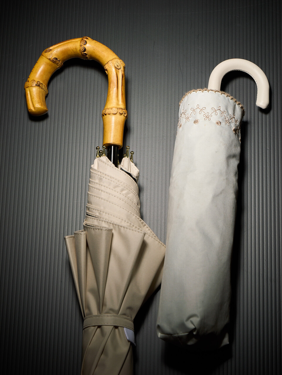 日傘2と並べて。重さは255g vs 320gで数値上は結構ちがうが、長傘の方が大きので軽く感じる。